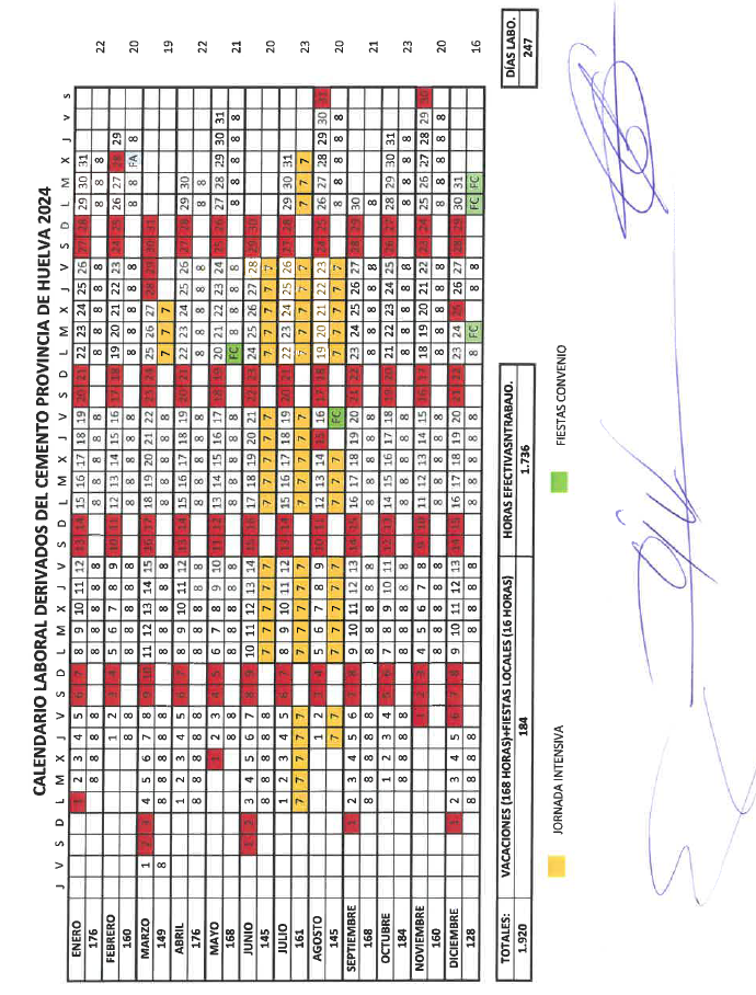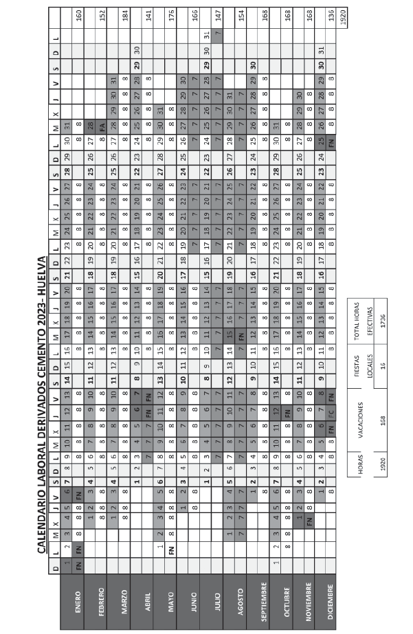 Las partes convienen en establecer el calendario del año 2023 para la Industrias de Derivados del Cemento, adecuando el número de horas de trabajo efectivo a las circunstancias del nuevo año, considerando festivos los días que constan en el calendario adjunto que se firma unido a la presente acta, teniendo en cuenta, además, que la jornada anual de trabajo será de 1736 horas.