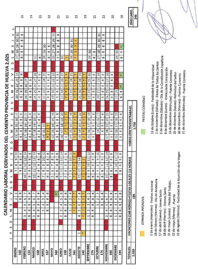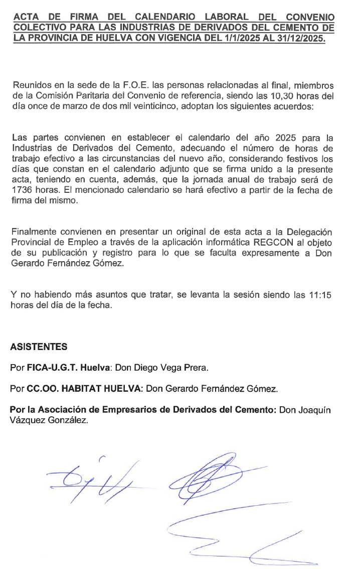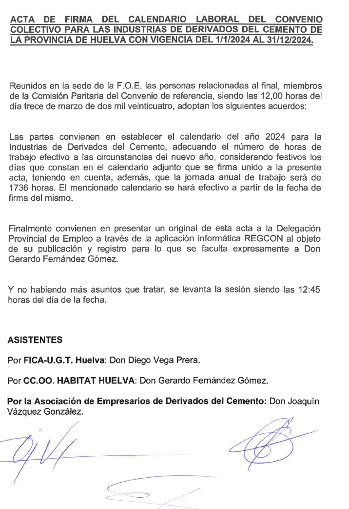 ACTA DE FIRMA DEL CALENDARIO LABORAL DEL CONVENIO COLECTIVO PARA LAS INDUSTRIAS DE DERIVADOS DEL CEMENTO DE LA PROVINCIA DE HUELVA CON VIGENCIA DEL 1/1/2023 AL 31/12/2023.