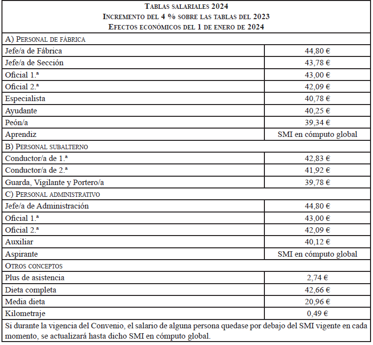 Para el año 2024 y con efectos de 1 de enero, se incrementan todos los conceptos económicos (a excepción de la antigüedad consolidada) para todas las categorías profesionales en un 4 % según figura en las tablas del anexo I.