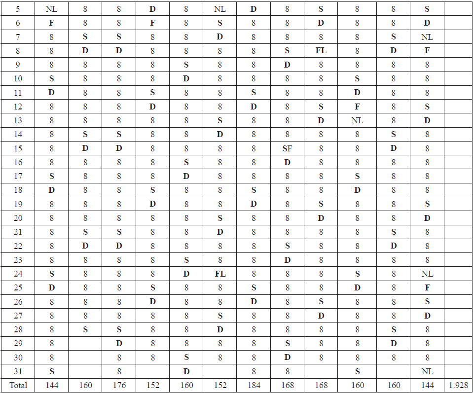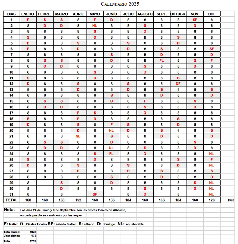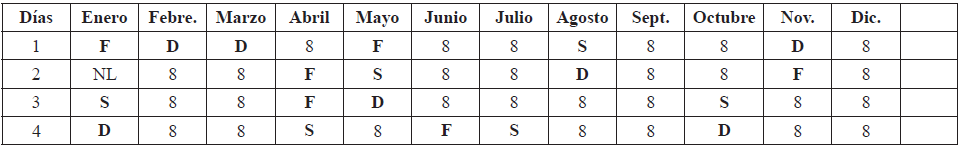 F: Festivo. FL: Fiestas locales. SF: Sábado festivo. S: Sábado. D: Domingo. NL: No laborable.