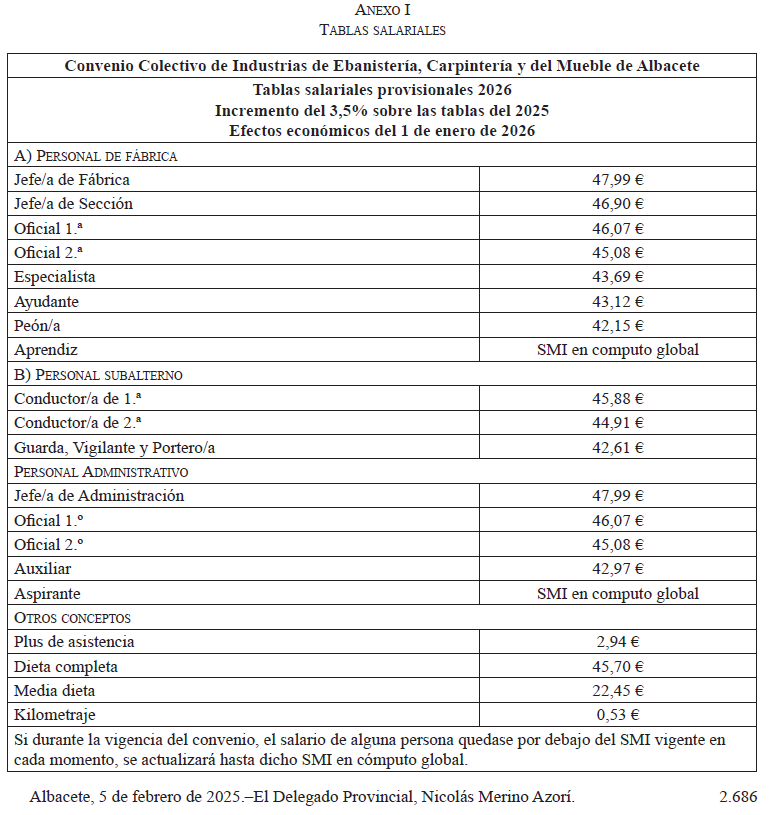 En la ciudad de Albacete, siendo las 12 horas del día 5 de febrero de 2026, y en los locales de FEDA, se reúnen las personas al margen relacionados, al objeto de actualizar las tablas salariales correspondientes al año 2026 del Convenio Colectivo Industrias de Ebanistería, Carpintería y del Mueble de la provincia de Albacete El precitado Convenio Colectivo publicado en el BOP n.º 126 de 28 de octubre de 2024, en su artículo 12 establece que: