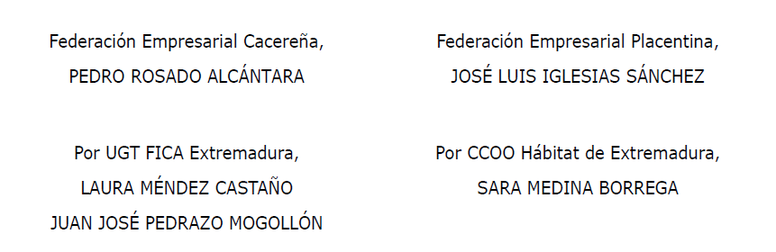 La Federación de Industria, construcción y agro (UGT FICA); CCOO de Hábitat, y las Federaciones Empresariales Cacereña y Placentina, como organizaciones empresariales más representativa y representantes en la provincia de Cáceres de CEOE y CEPYME, al no existir organización empresarial sectorial local que cumpla los requisitos de representatividad establecidos en el estatuto de los trabajadores, todo ello de conformidad con lo dispuesto en el artículo 87.2 del citado cuerpo legal, manifiestan y acuerdan: