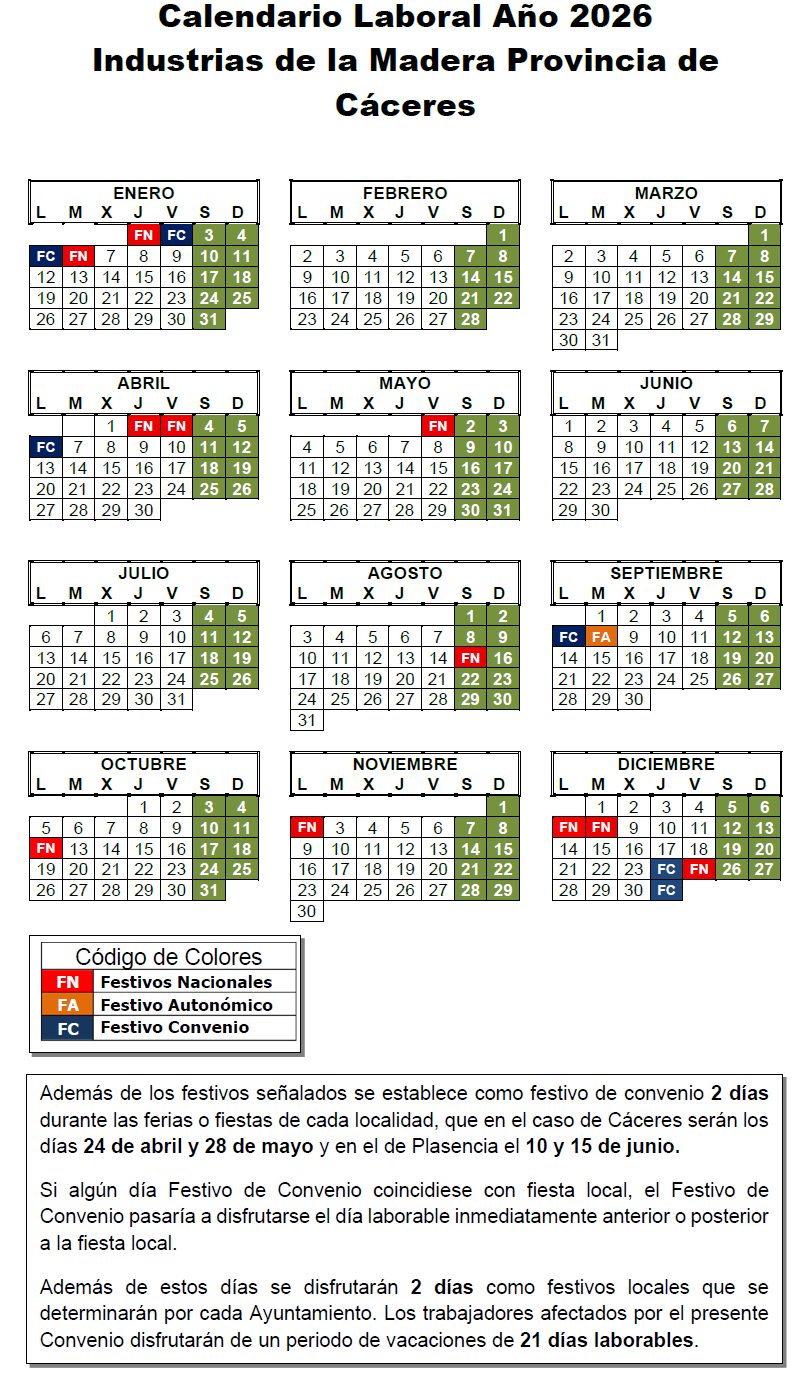 1º Establecimiento del calendario laboral 2026 para el sector de la Industria de la Madera para Cáceres y su provincia.