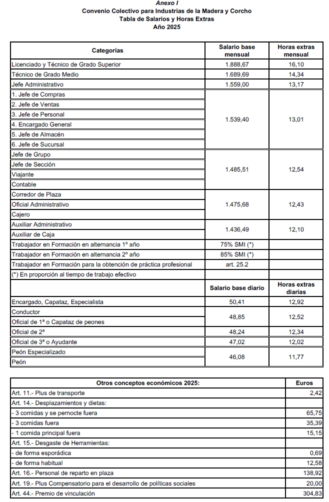 Tablas Salariales y Calendario Laboral del año 2025 para el Convenio colectivo de Industrias de la Madera y Afines de la provincia de Jaén.