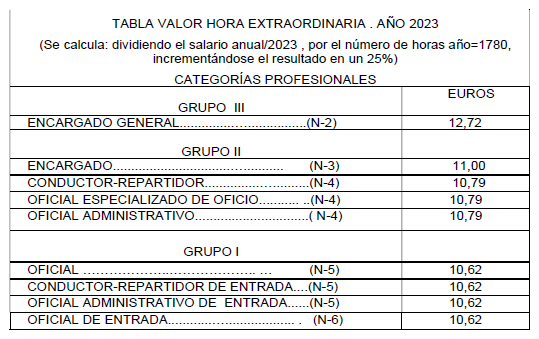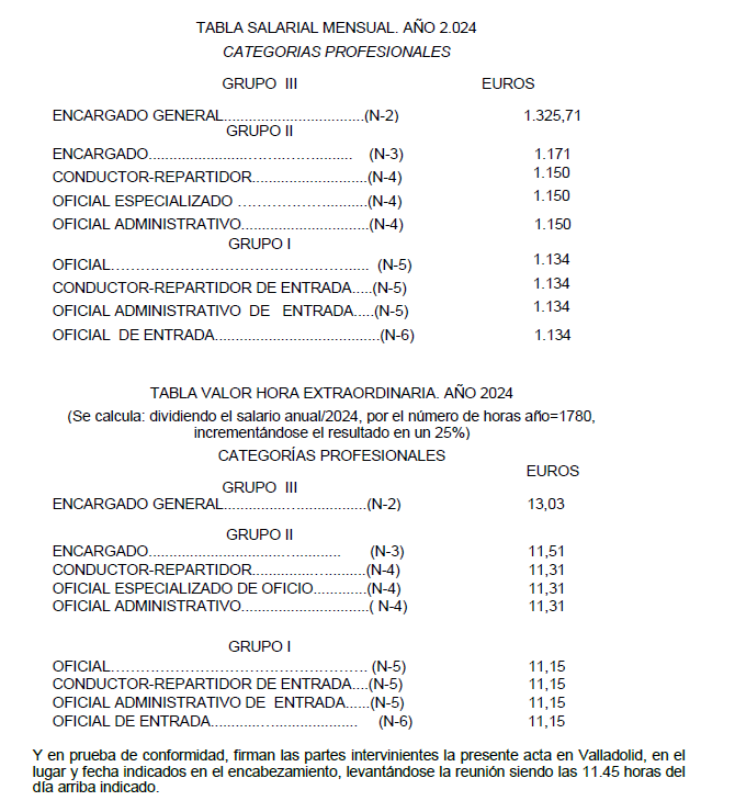 – La comisión negociadora del Convenio se reunirá en el momento que se conozca el SMI o, en todo caso, en el mes de febrero, para firmar las tablas salariales para dicho año, además de la tabla valor hora extraordinaria.