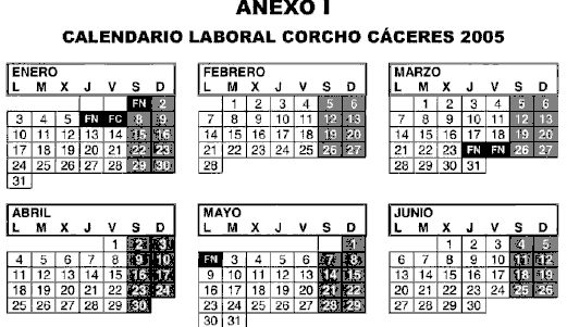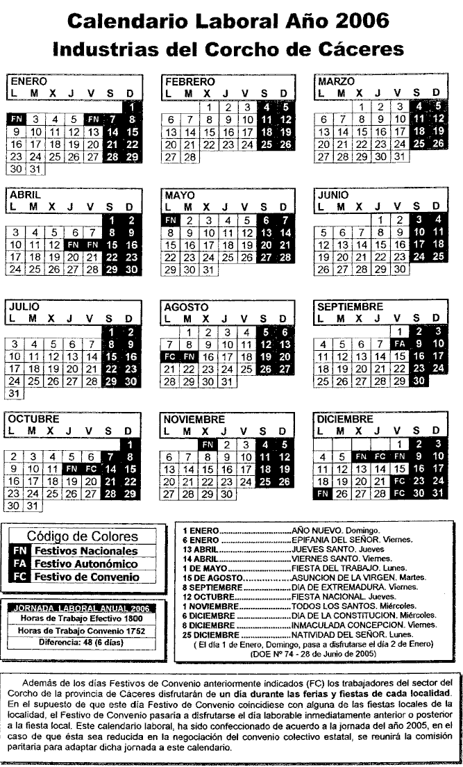 1. Según lo establecido en el artículo 38 del Convenio Colectivo Estatal para las Industrias del Corcho, la comisión paritaria provincial procede a adecuar el calendario laboral de los trabajadores del sector, acordándose el calendario laboral para el año 2006. Dado que la vigencia del convenio colectivo termina el 31 de diciembre de 2005, el calendario laboral se confecciona con arreglo a la jornada laboral del año 2005, establecida en 1.752 horas anuales, en el caso de que se negociara en el Convenio Colectivo Estatal una jornada inferior para el año 2006, se procederá a la adecuación del calendario laboral.