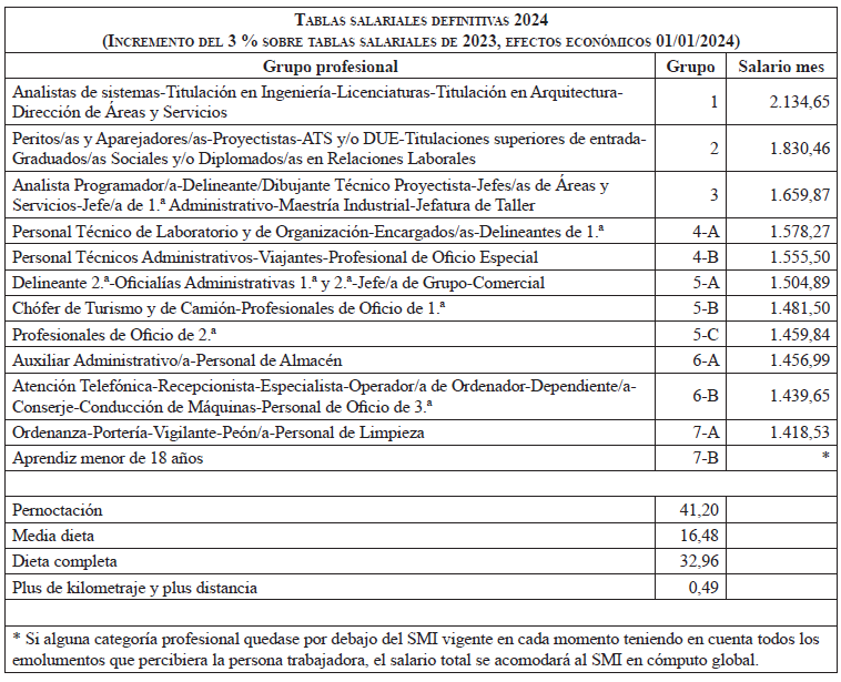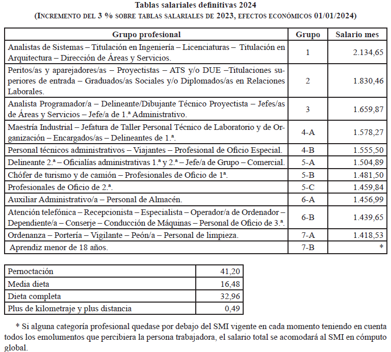 Vista: El acta de fecha 1 de abril de 2024, suscrita por la Comisión Negociadora del Convenio Colectivo de las Industrias, las Nuevas Tecnologías y los Servicios del Sector del Metal, con código número 02000195011981, en la que se procede a fijar las tablas definitivas para el año 2024.