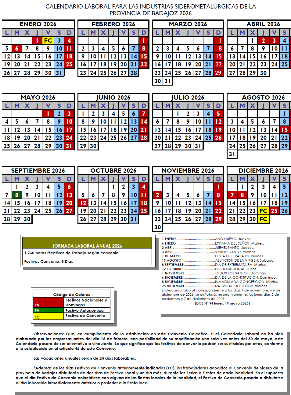 RESOLUCIÓN de 4 de noviembre de 2025, de la Dirección General de Trabajo, por la que se ordena la inscripción en el Registro de Convenios y Acuerdos Colectivos de Trabajo de la Comunidad Autónoma de Extremadura y se dispone la publicación del Acta de fecha 29 de octubre de 2025, en la que se acuerda el calendario laboral para el año 2026 del Convenio Colectivo de sector Industrias Siderometalúrgicas para la provincia de Badajoz. (2025063986).