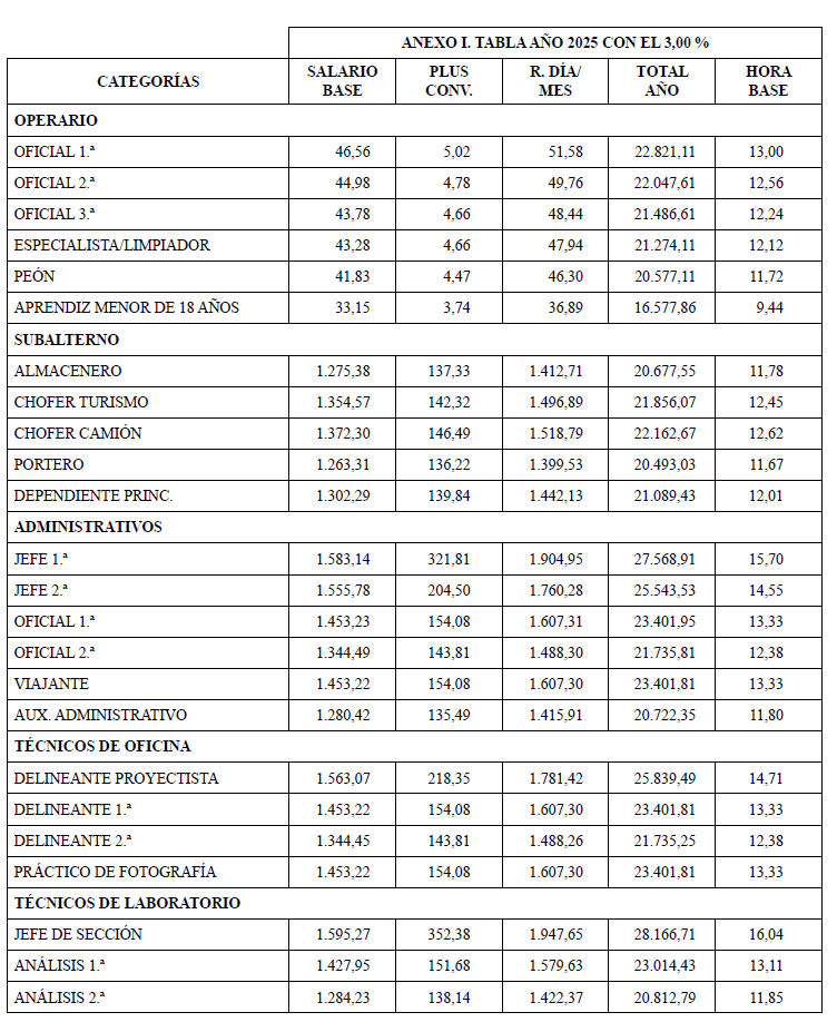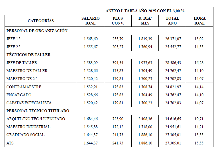 Para el año 2025 Se establece un incremento salarial para todos los conceptos del convenio del 3,00 % sobre las tablas vigentes a 31 de diciembre de 2024. Se adjuntan las tablas salariales como anexo I.