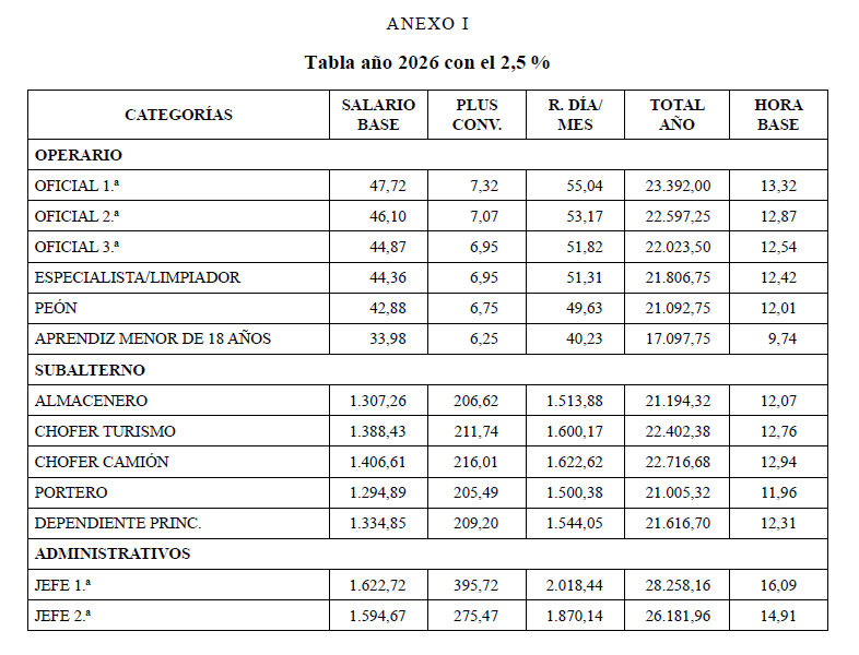 Para el año 2026 se establece un incremento salarial para todos los conceptos salariales del convenio del 2,50 % sobre las tablas vigentes a 31 de diciembre de 2025 (anexo I tabla salarial).