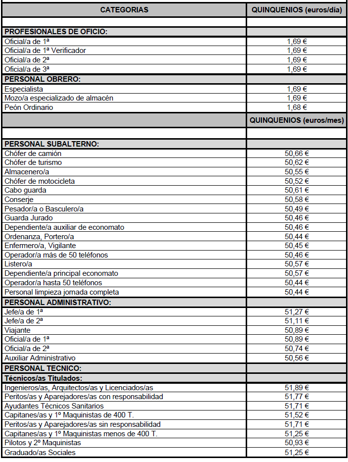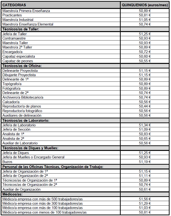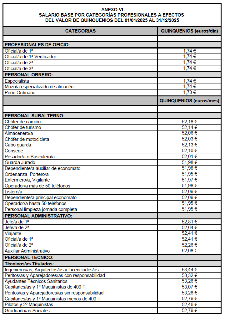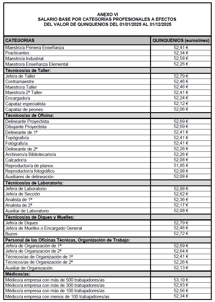 3) Aprobar el Anexo VI «Salario base por categorías profesionales a efectos del valor de quinquenios del 01.01.2025 al 31.12.2025».