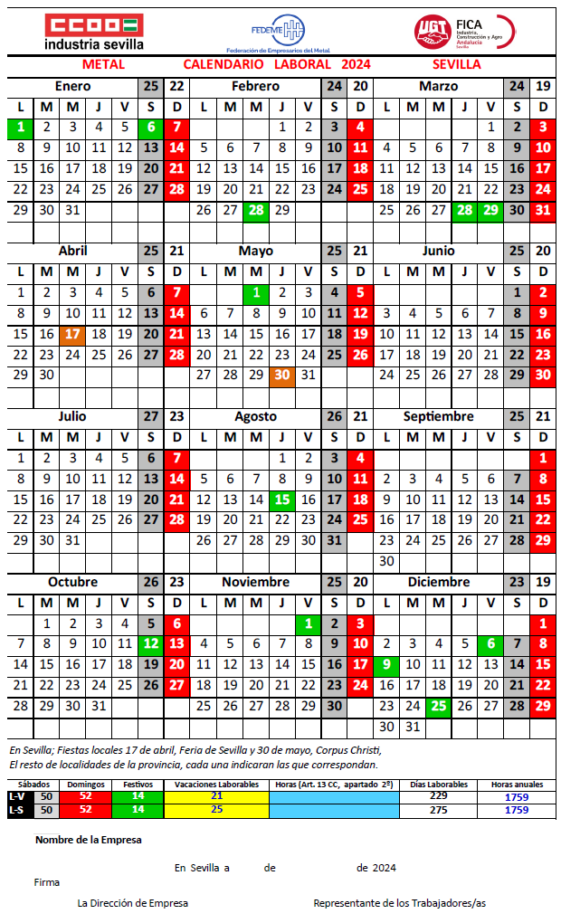 En la ciudad de Sevilla, siendo las 9.00 horas del día 24 de octubre de 2025 se reúnen en la Sala de Junta de la Federación de Empresarios del Metal de Sevilla (FEDEME) los integrantes de la Comisión Paritaria del Convenio Colectivo para las Industrias Siderometalúrgicas de Sevilla abajo firmantes: