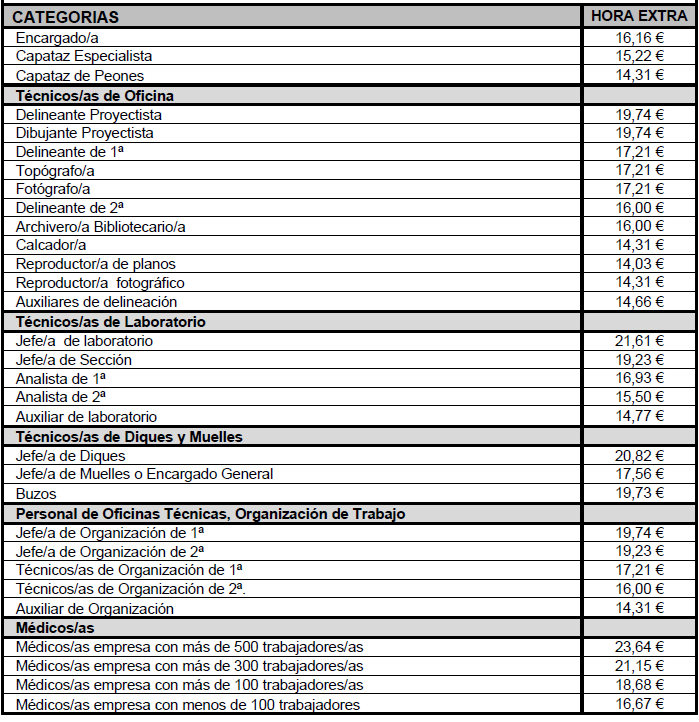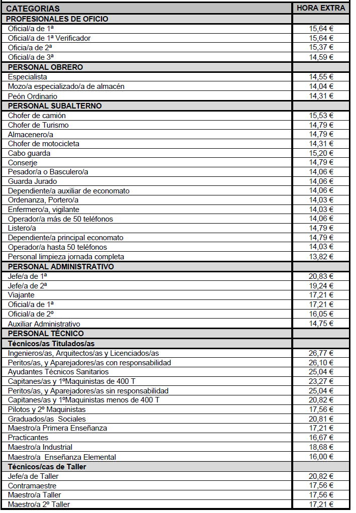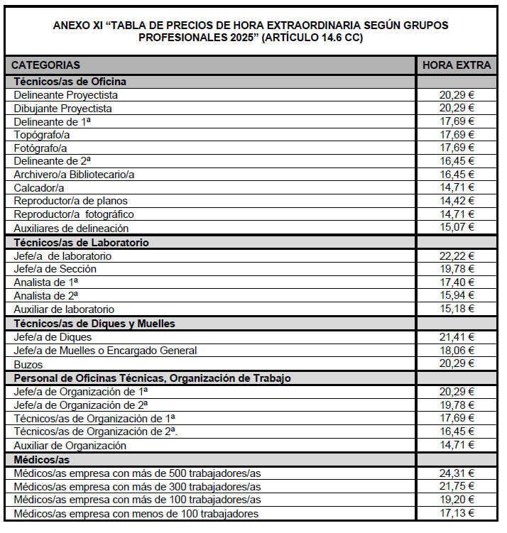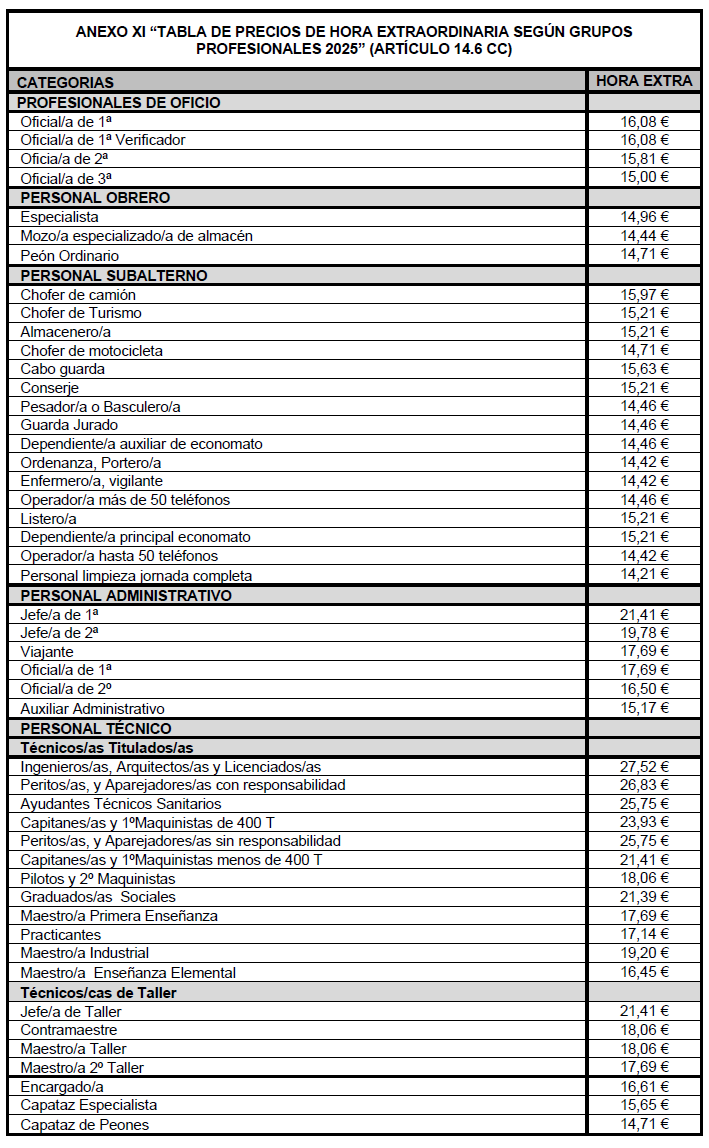 4) Aprobar el Anexo XI «Tabla de precios de hora extraordinaria según grupos profesionales 2025 (Art.14.6 CC)».