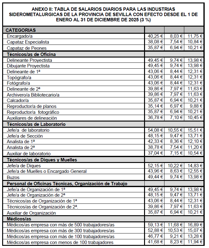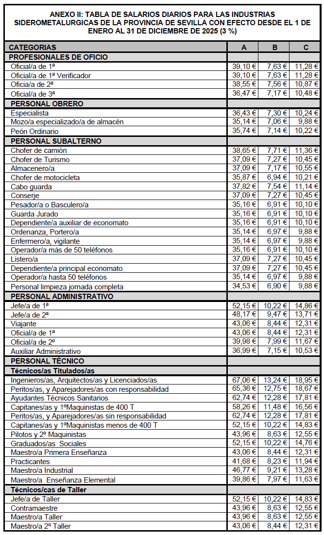 1) Aprobar la «Tabla de salarios diarios para las Industrias Siderometalúrgicas de la provincia de Sevilla con efecto desde el 1 de enero hasta el 31 de diciembre de 2025 (3%)»(Anexo II).