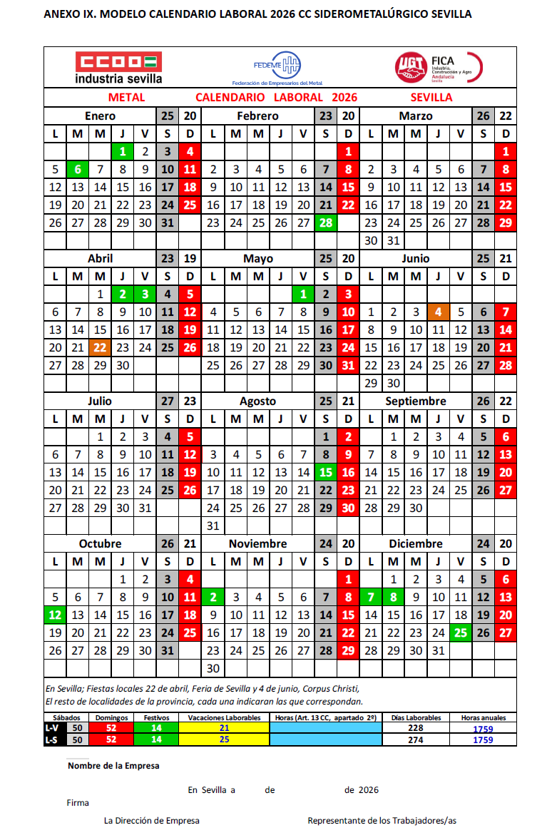 VISTO el Acuerdo de la Comisión Paritaria del Convenio Colectivo para las Industrias Siderometalurgicas de Sevilla (Código 410025011982), aprobado el calendario laboral para el 2026.