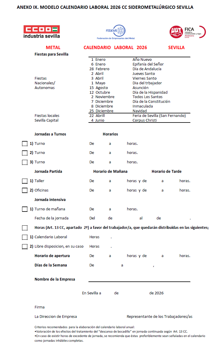 1) Aprobar el Modelo de Calendario laboral del Convenio Colectivo para las Industrias Siderometalúrgicas de la provincia de Sevilla correspondiente al año 2026 (Anexo IX).