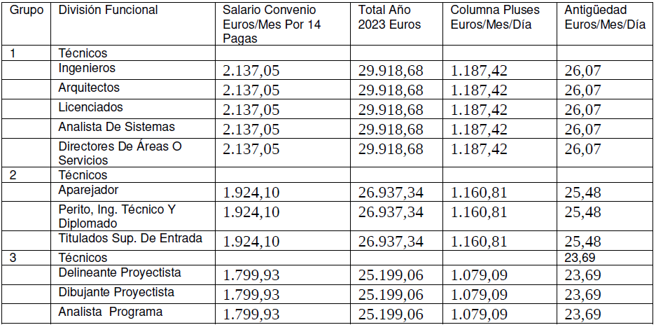 Queda establecido un salario bruto anual, prorrateado en catorce mensualidades para cada uno de los grupos profesionales, que será idéntico para todas las divisiones funcionales de cada grupo, su importe quedará determinado en la columna 1 denominada salario convenio.