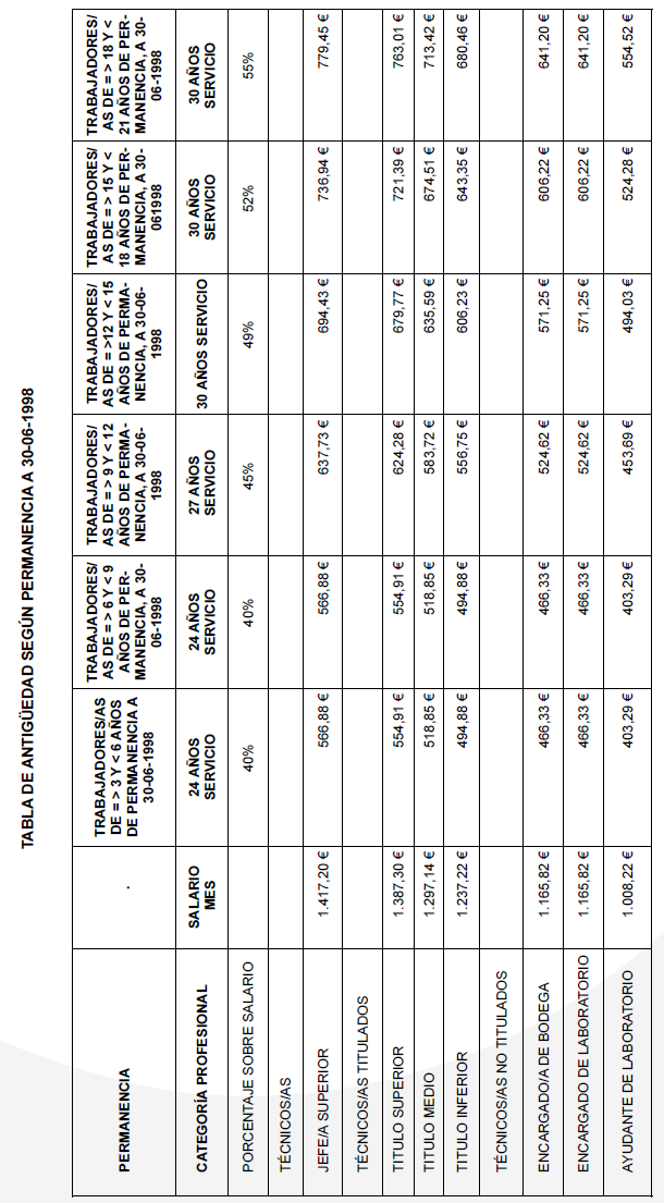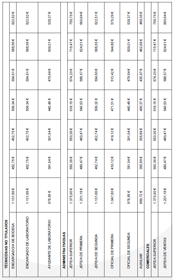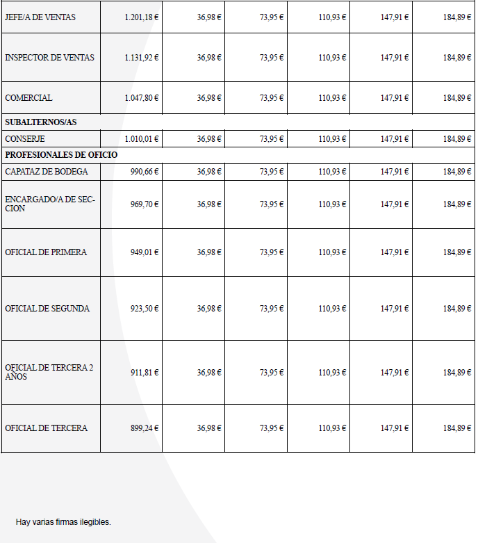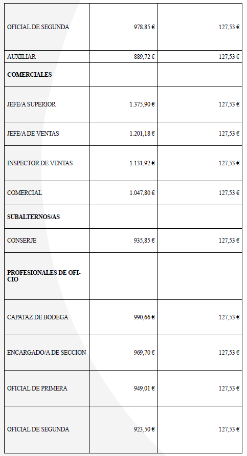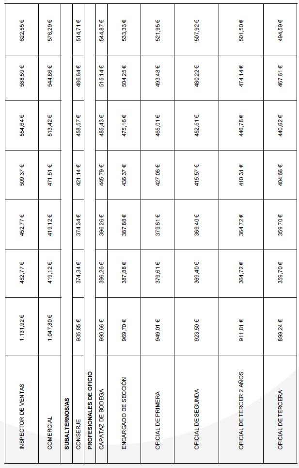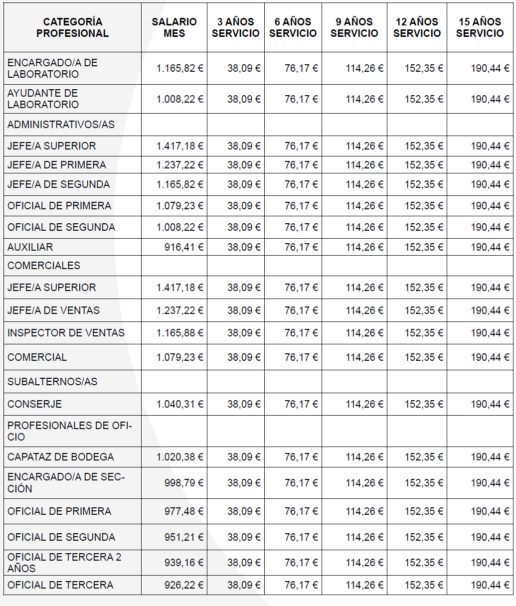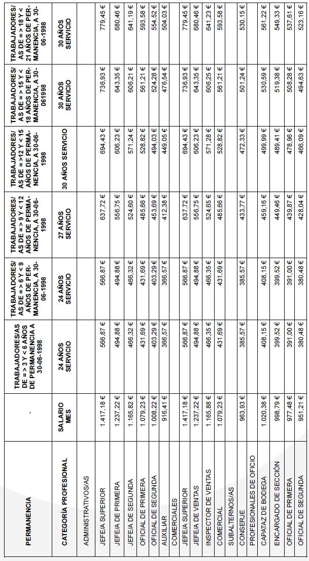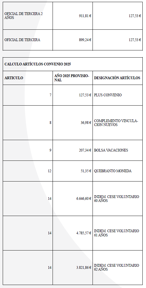 Para el año 2025 el salario mínimo a percibir será 1.184 € en 14 mensualidades, aquí estarán incluidos los complementos salariales que por Ley computan para el cálculo del SMI. En caso de no alcanzar esa cifre la empresa complementará hasta la cantidad de 1.184 € mensuales a través de un complemento personal no consolidable. La comisión paritaria se reunirá cada vez que se publique el SMI anual para regular dicha cláusula.