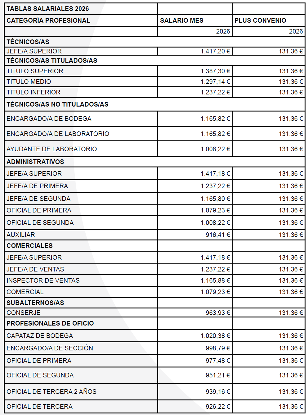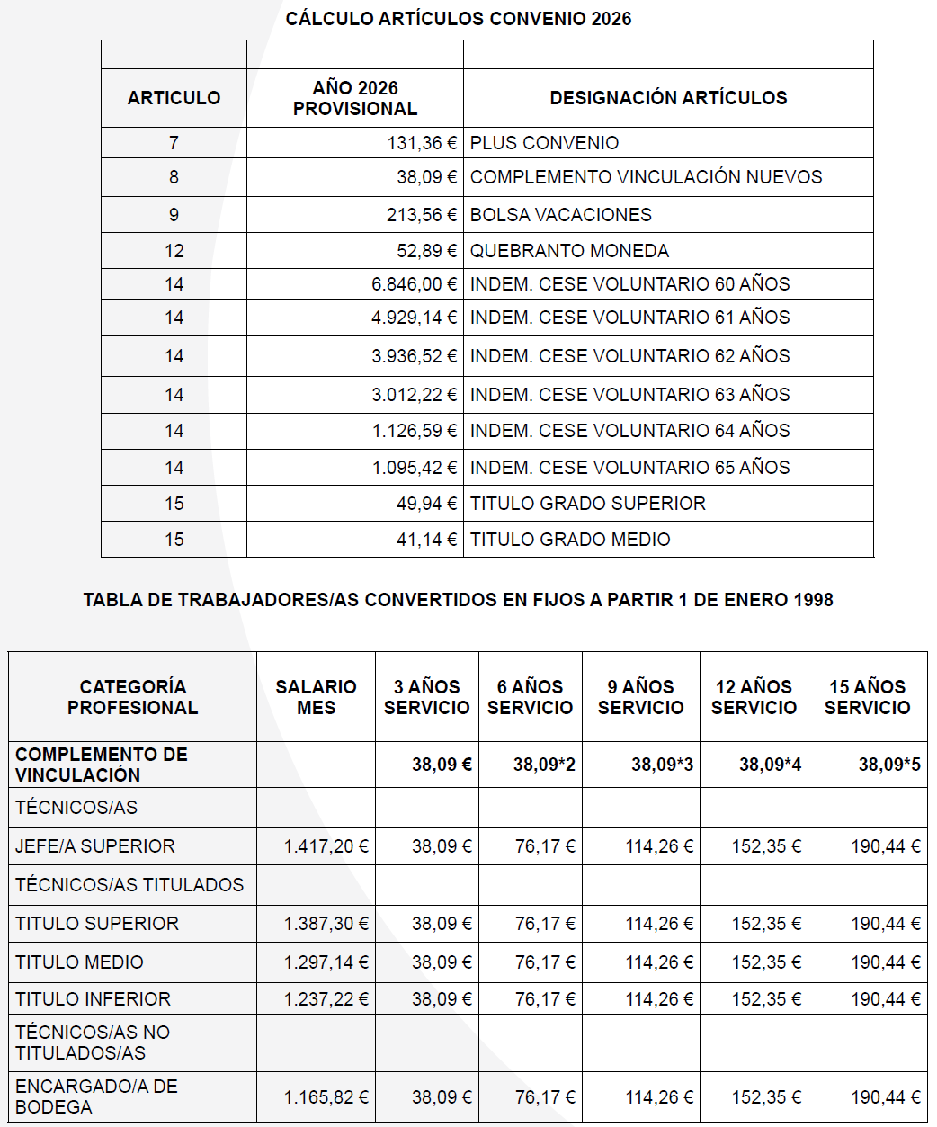Primero. Proceder a actualizar las tablas salariales con efectos desde el 1 de enero 2026, con un incremento del 3% tomando como referencia las tablas de 2025. Se acompañan como anexo las tablas salariales correspondientes al año 2026 incluyendo el incremento previsto (3%).