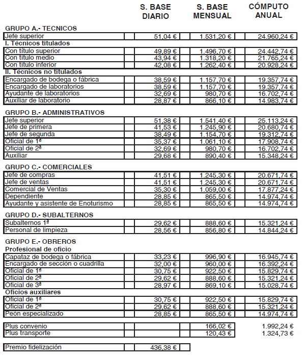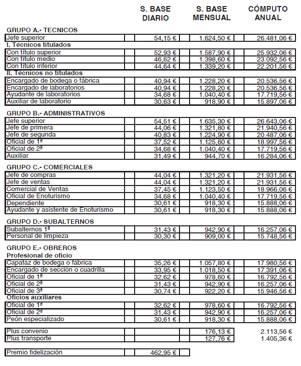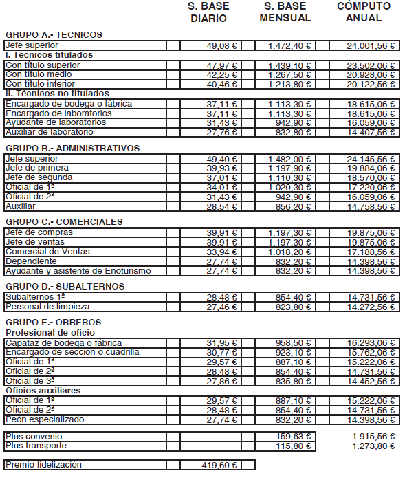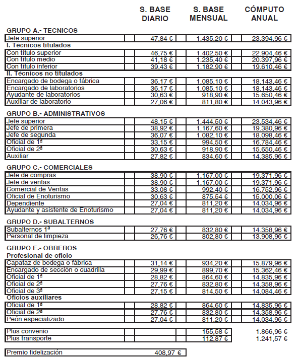 A partir de la publicación de este Convenio en el B.O.P. de Huesca, se crea una categoría nueva, dentro del Grupo C. Comerciales, de «OFICIAL DE ENOTURISMO», con el salario reflejado en las tablas adjuntas.