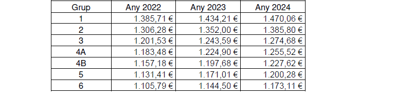 L’increment salarial per a tots els conceptes salarials per l’any 2022 serà del 4%, sobre les taules salarials del 2021; per l’any 2023 del 3,5% sobre les taules salarials del 2022; i per l’any 2024 del 2,5% sobre les taules salarials del 2023; amb revisió salarial que garanteix en taules al final de la vigència del conveni, el 85% del IPC de Catalunya acumulat dels tres anys.