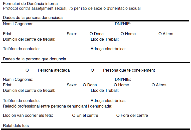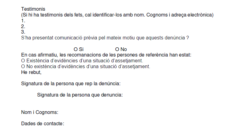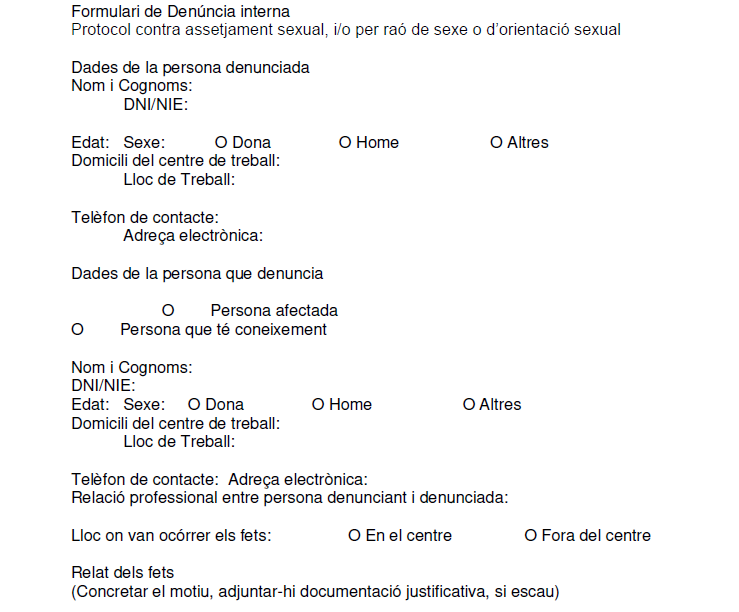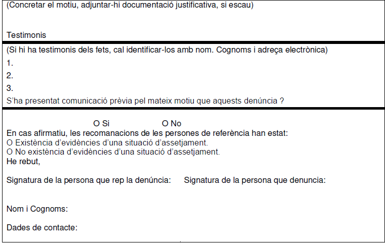 La denúncia es presenta a la persones anomenades en cada centre de treball.