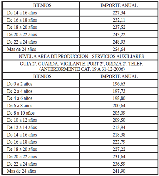 Las personas que desarrollen funciones de portería, guardería y vigilancia, que no puedan disfrutar de las jornadas señaladas en el artículo 36 percibirán el importe de su exceso, a prorrata de sus salarios base de tabla, antigüedad y, en su caso, CPB2007, incrementados con un treinta por ciento.