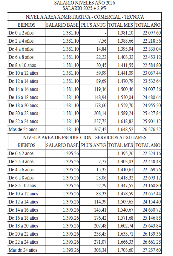 – Para el año 2026: incremento fijo a tablas del IPC real del año 2025 con efectos retroactivos desde 01/01/2026