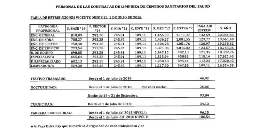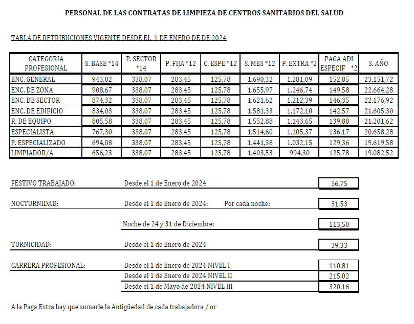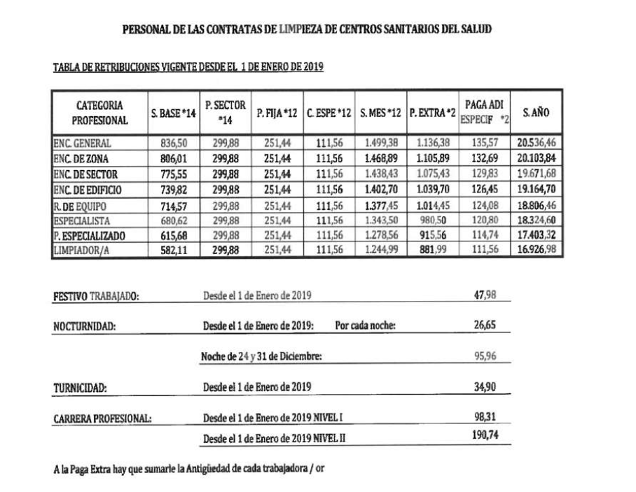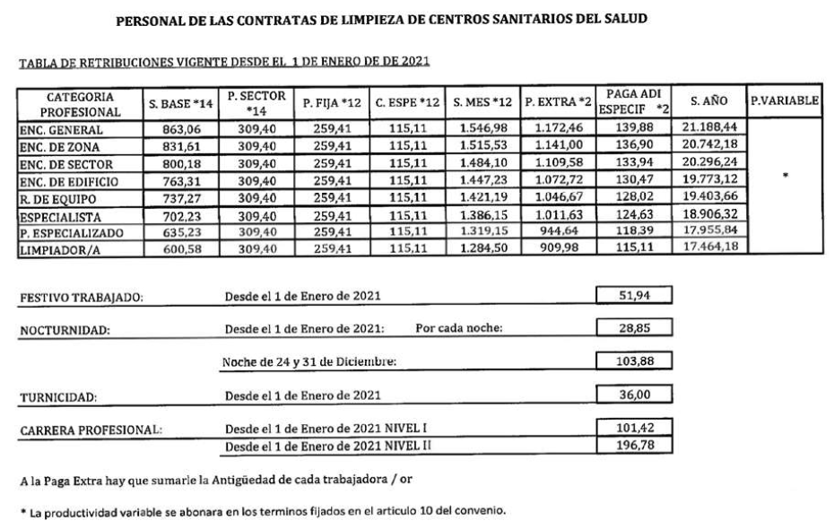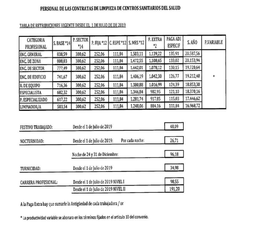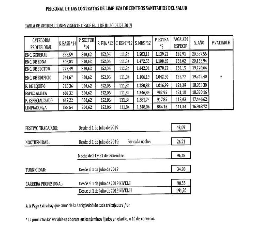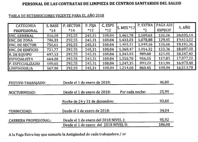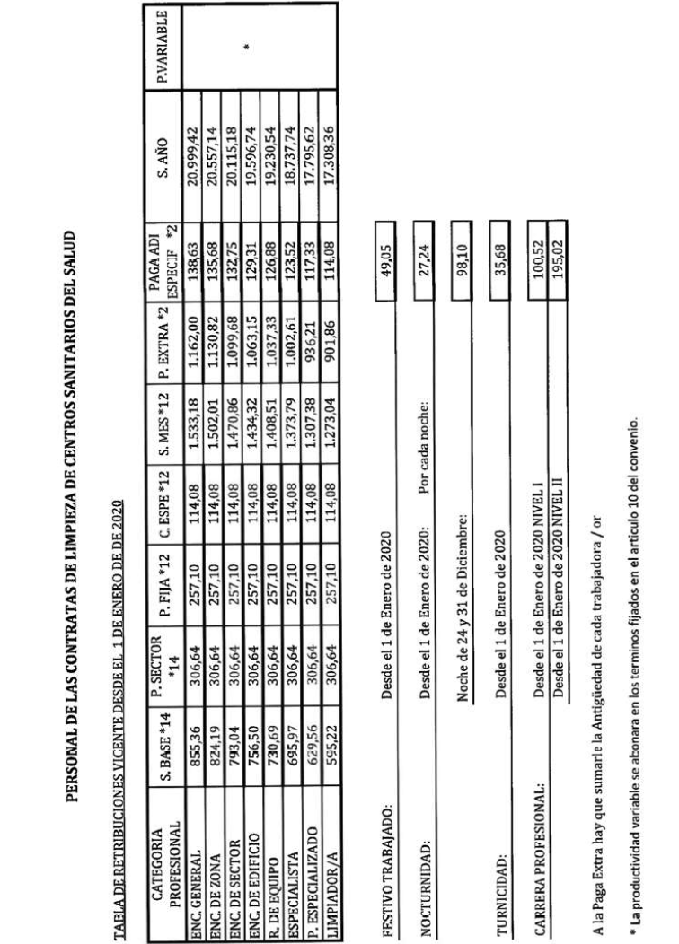 Las empresas concesionarias de las contratas para la limpieza de los Centros Sanitarios dependientes del SALUD, abonarán a los trabajadores adscritos a dichos servicios, en cada momento, los mismos conceptos salariales e importes salariales que abone el SALUD al personal estatutario del Grupo E o categoría equivalente del SALUD.