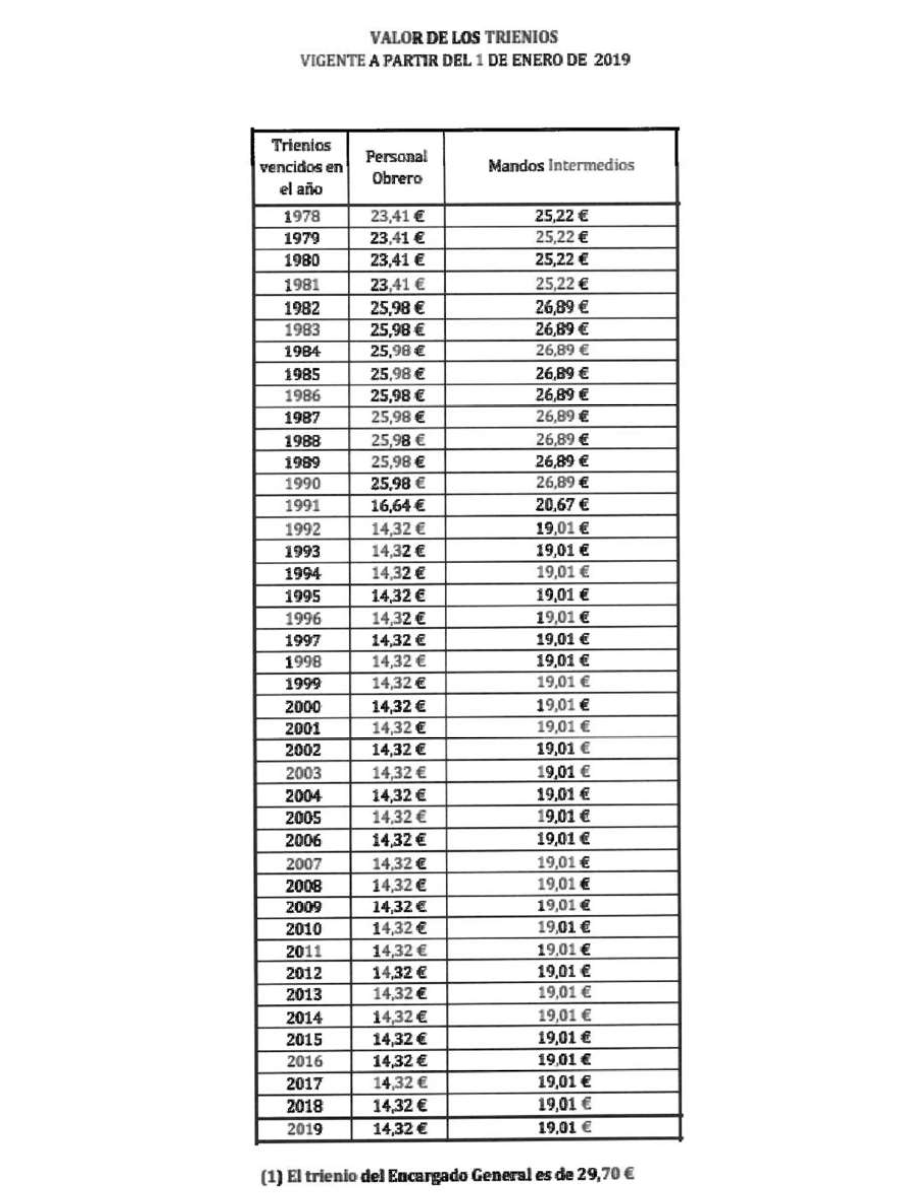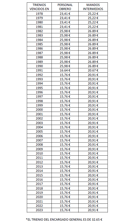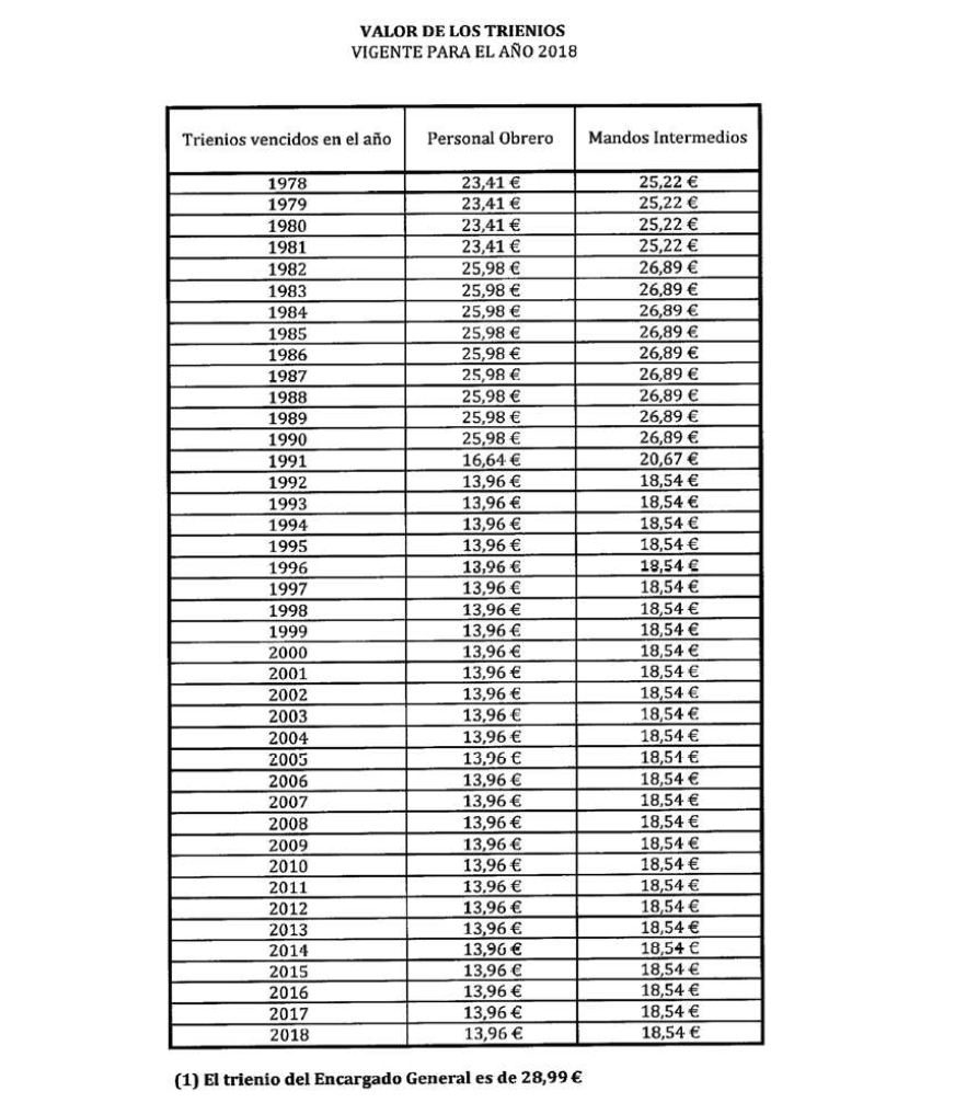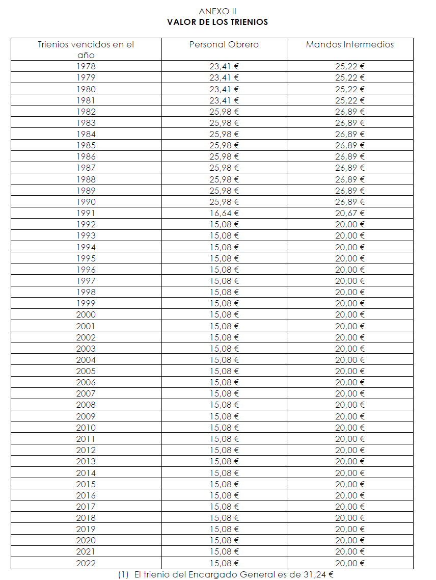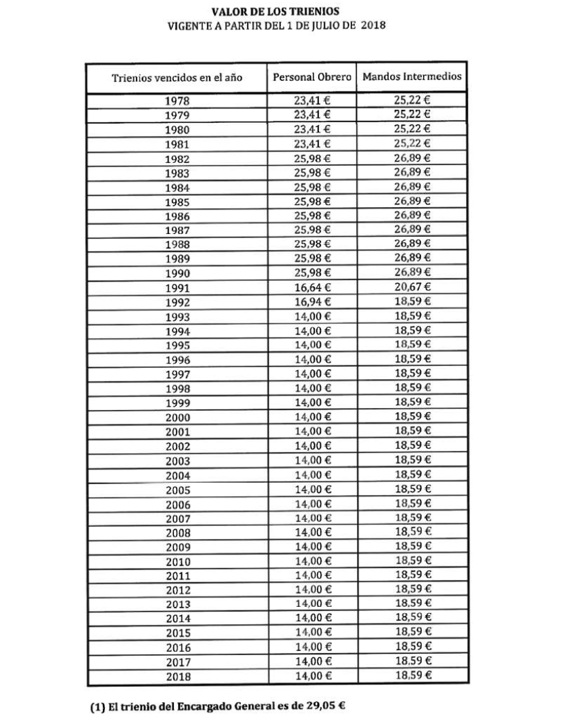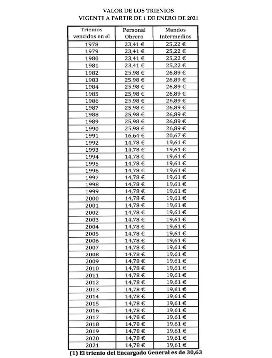 Los trienios vencidos a partir del 1 de enero de 1992 se incrementarán anualmente según la subida salarial pactada en convenio, que será igual a la que en cada momento se determine para el personal estatutario del SALUD. El valor de los trienios será el que figura en el anexos.