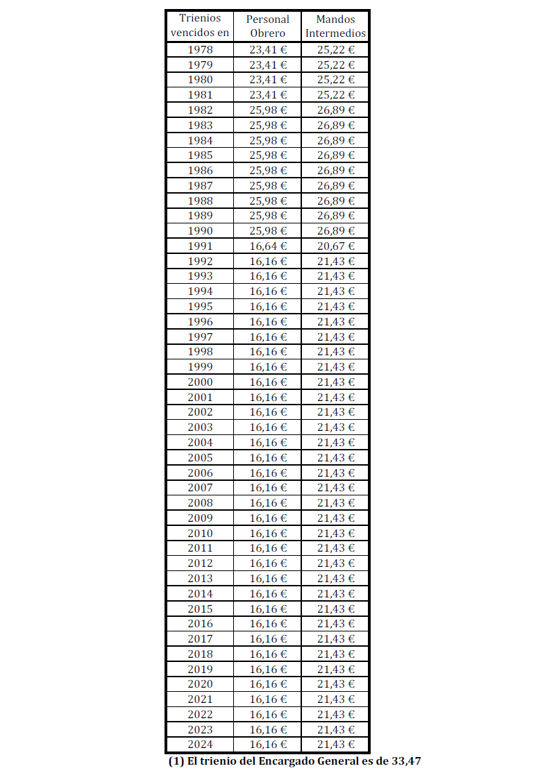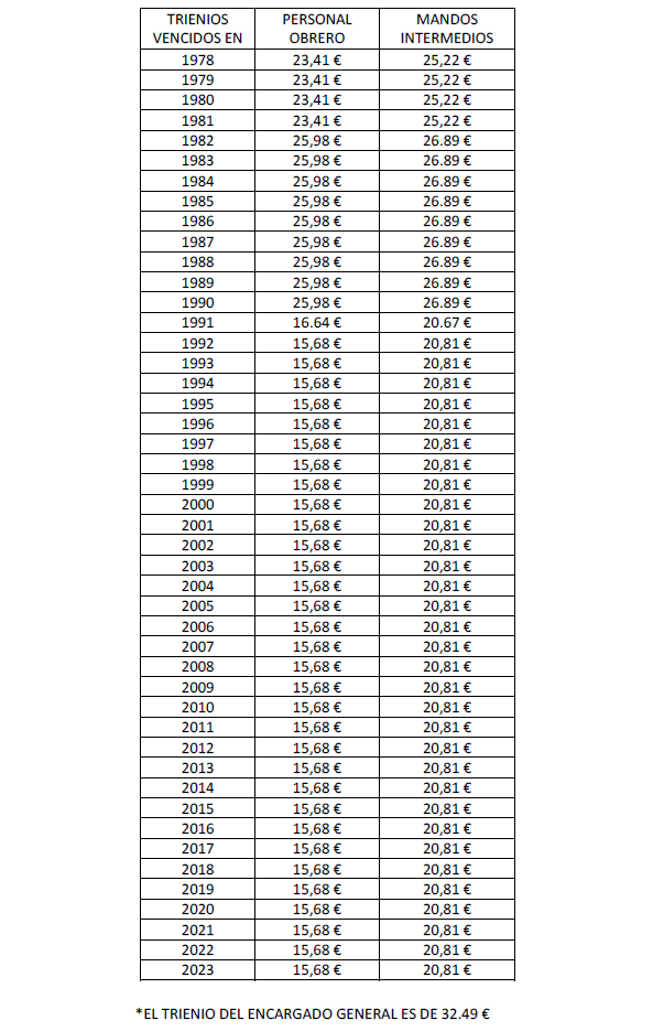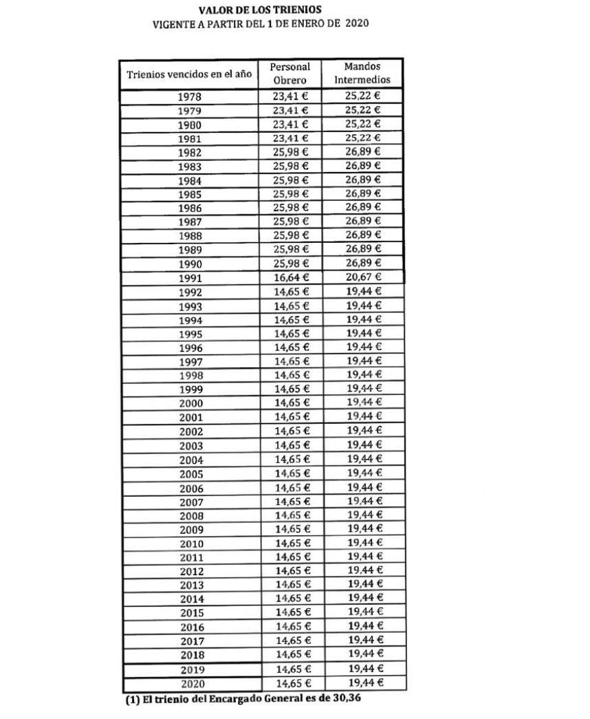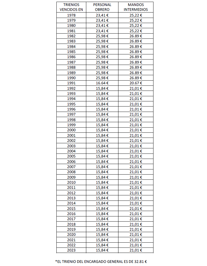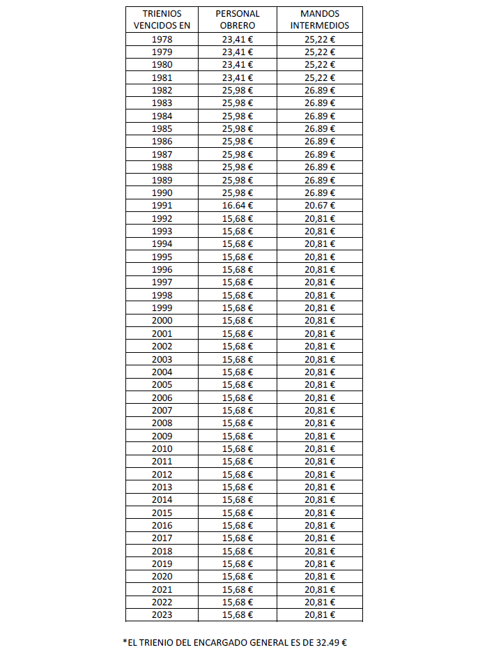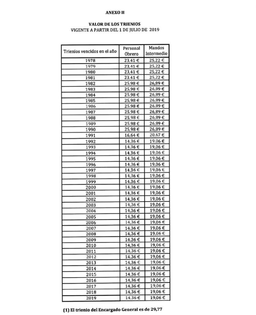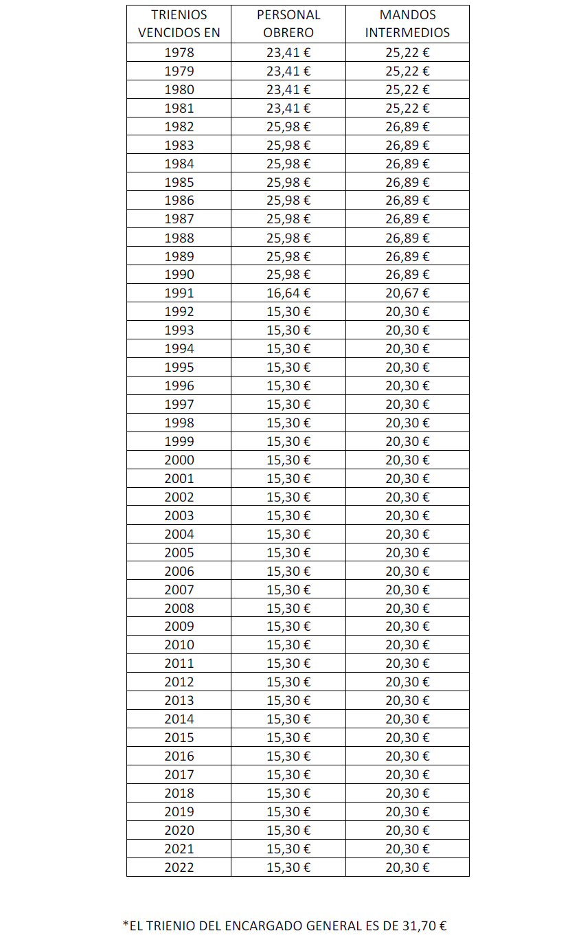 Los trienios vencidos a partir del 1 de enero de 1992 se incrementarán anualmente según la subida salarial pactada en convenio, que será igual a la que en cada momento se determine para el personal estatutario del SALUD. El valor de los trienios será el que figura en el anexos.