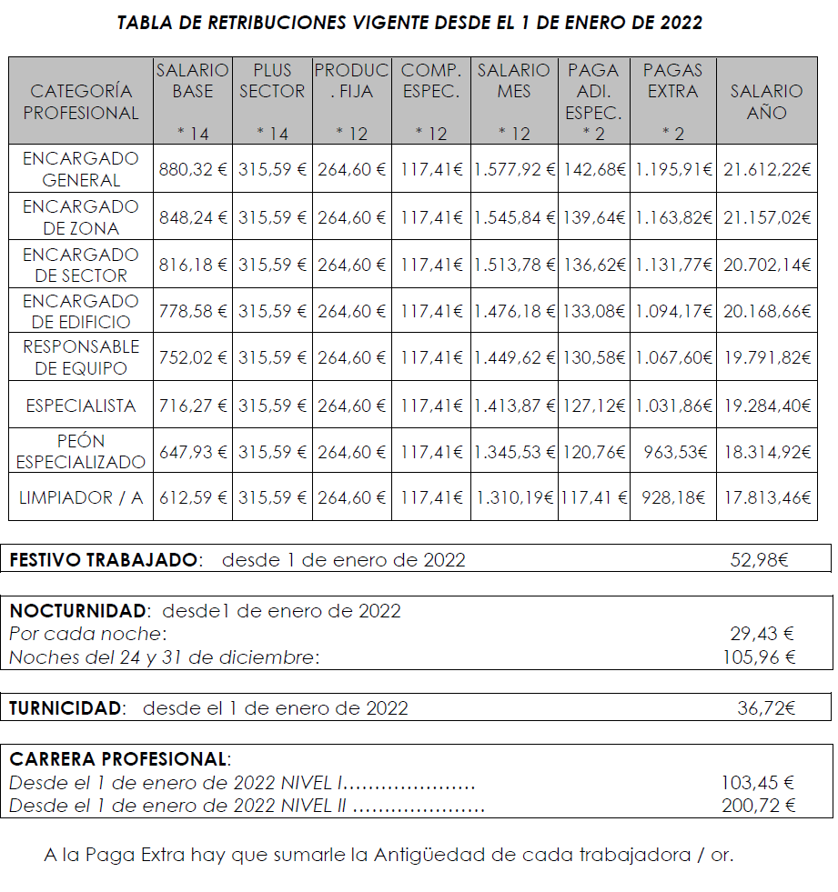 Una vez calculadas y cotejadas por todas las organizaciones firmantes del Convenio Colectivo, se conviene en evacuar las tablas salariales de 2022, con efectos económicos desde el 1 de enero de dicho año, que se adjuntan a la presente acta.