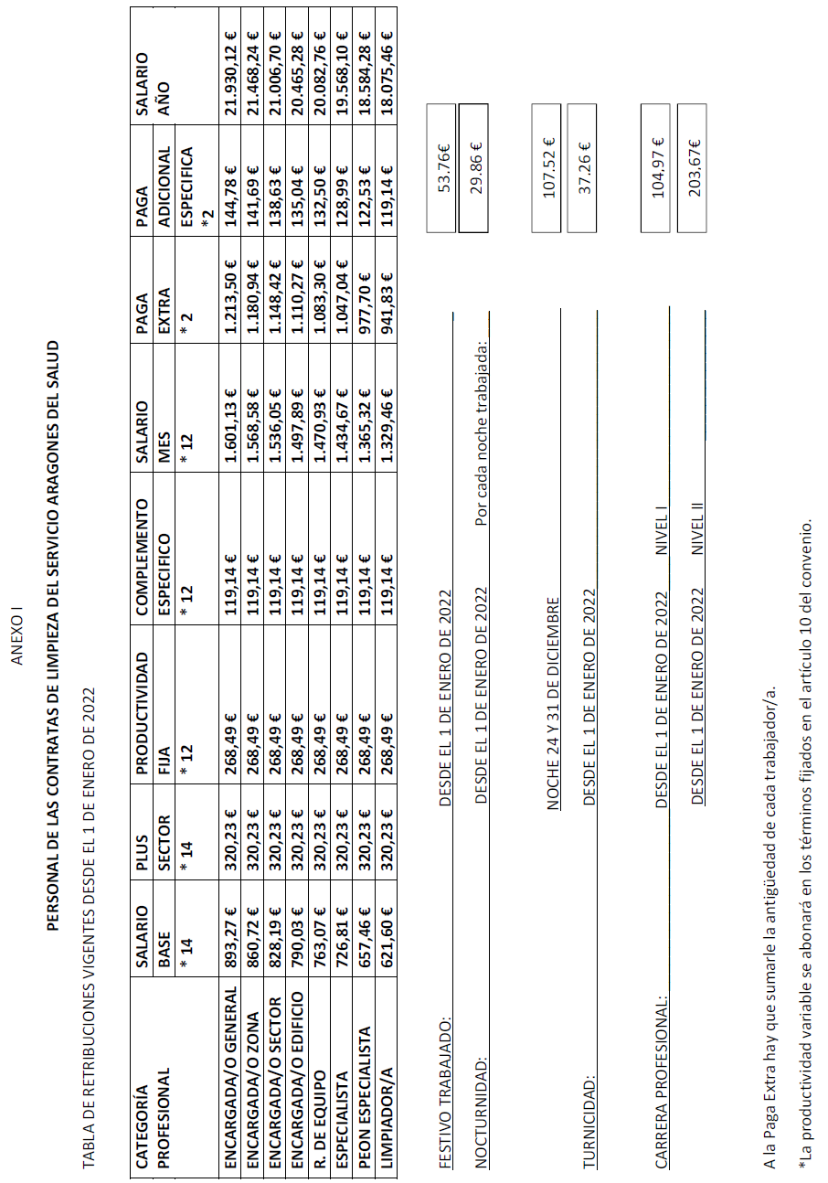 RESOLUCIÓN de 23 de febrero de 2023, de la Directora General de Trabajo, Autónomos y Economía Social, por la que se acuerda el depósito y publicación del acta de actualización de las tablas salariales para 2022 del Convenio Colectivo de trabajo del Sector de Limpieza de centros sanitarios dependientes del Servicio Aragonés de Salud.