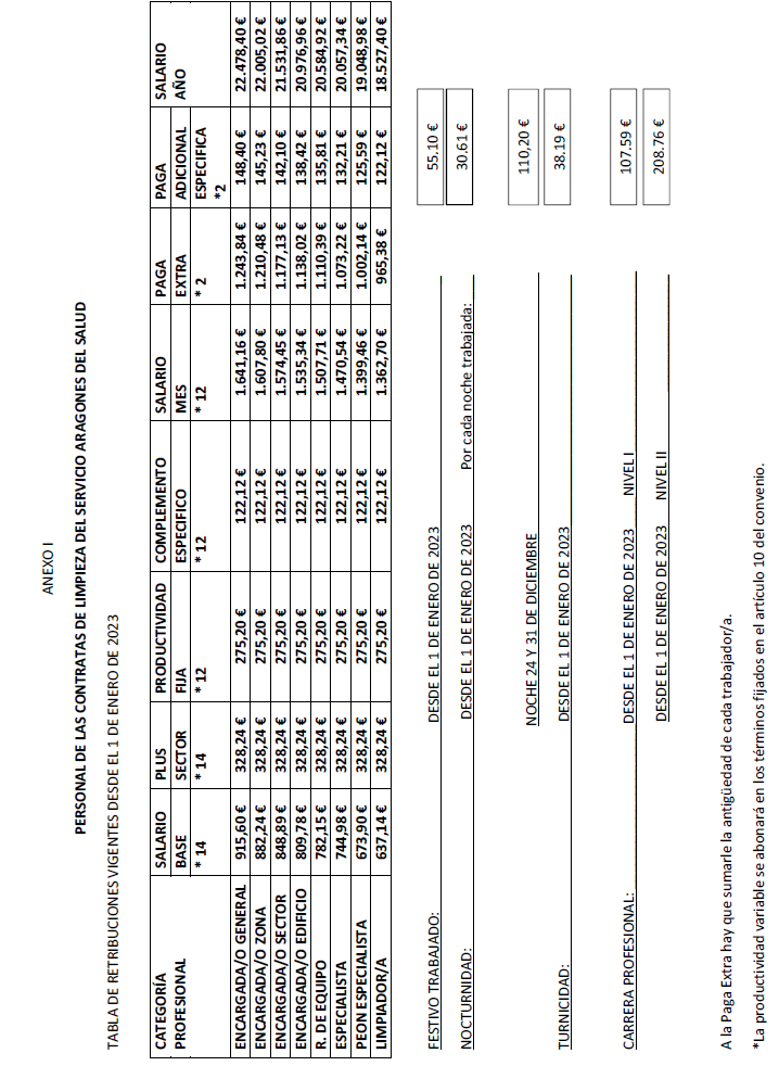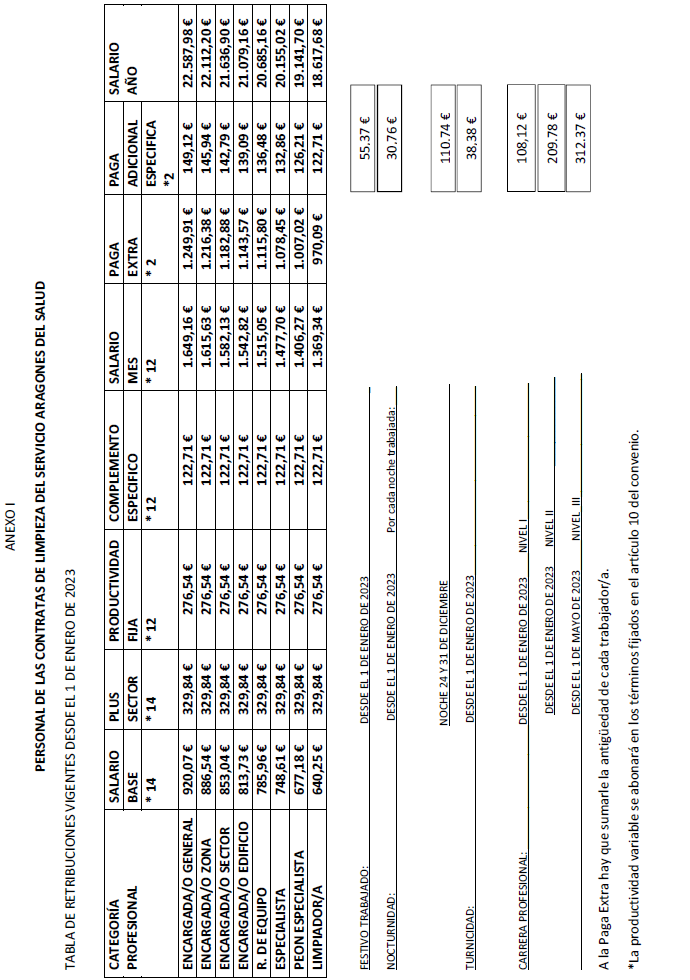 Vista el acta de la comisión paritaria del Convenio Colectivo de Limpieza de Centros Sanitarios Dependientes del Servicio Aragonés de Salud de la Comunidad Autónoma de Aragón, suscrita el día 11 de septiembre de 2023, de una parte, por la organización empresarial ASPEL y, de otra, por las organizaciones sindicales UGT, CC.OO y OSTA y recibida en esta Dirección General de Trabajo el día 12 de septiembre de 2023 y subsanada el 21 de septiembre de 2023, se vuelve a dar publicidad a las retribuciones de 2023, ya publicadas en «Boletín Oficial de Aragón», número 115, de 19 de junio de 2023, con la inclusión de la Carrera Profesional nivel III, en aplicación de lo establecido en el artículo 10 del Convenio Colectivo indicado, publicado en el «Boletín Oficial de Aragón», número 88, de 10 de mayo de 2022, mediante Resolución de 28 de abril de 2022, de la Directora General de Trabajo, Autónomos y Economía Social.
