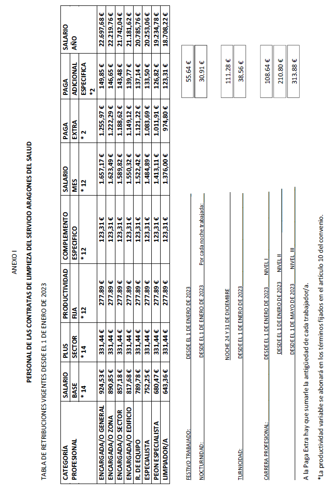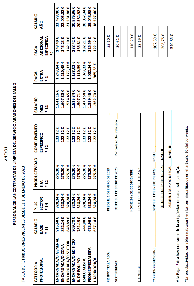 Toda vez que se ha constatado que, por acuerdo entre el Gobierno de Aragón y los sindicatos representativos en la sanidad pública de Aragón, se ha activado para todos los niveles profesionales el nivel III de la Carrera Profesional, y que las personas trabajadoras del Servicio Aragonés de la Salud ya han visto satisfechas esas percepciones salariales en sus nóminas, procede reconocer ese mismo derecho económico en favor de las personas trabajadoras de la limpieza de centros sanitarios del SALUD en la comunidad autónoma de Aragón. Para ello, esta comisión paritaria vuelve a dar publicidad a las retribuciones de 2023 ya publicadas en el BOA de 19 de junio de 2023, con la única inclusión y variación de la inclusión dentro de apartado ‘Carrera profesional’ de la referencia a ese Nivel III y su importe.