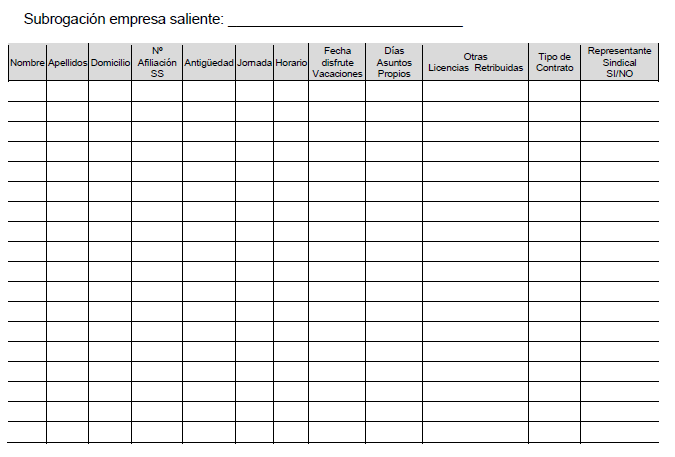 Para la tramitación de la subrogación la empresa saliente deberá suministrar a la entrante relación de personal, en formato electrónico de hoja de cálculo según el modelo especificado en el anexo II, en la que se detalle: Nombre y apellidos, domicilio, número de afiliación a la Seguridad Social, antigüedad, jornada, horario, vacaciones, días de asuntos propios ya disfrutados y justificación de otras licencias retribuidas y cualquier modificación de estos datos que se haya producido en los seis meses anteriores junto con la justificación de la misma, modalidad de su contratación, especificación del período de mandato si el trabajador/a es representante sindical y fecha de disfrute de sus vacaciones.