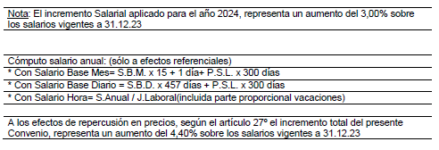 – Para 2024 un incremento del 3,00% sobre los Salarios vigentes a 31-12-2023, sin Revisión Salarial.