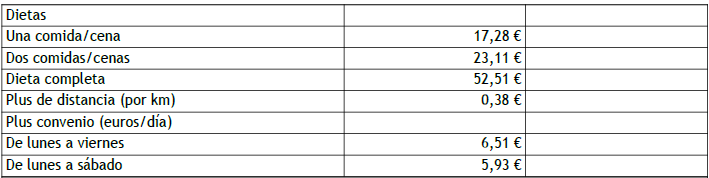 – Dieta completa: 46,21 € para 2022, 47,60€ para el año 2023, 49,02€ para el año 2024, 50,49€ para el año 2025 y 52,51€ para el año 2026.