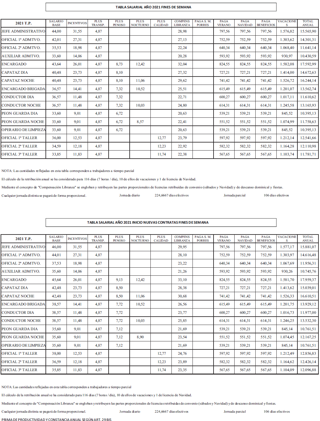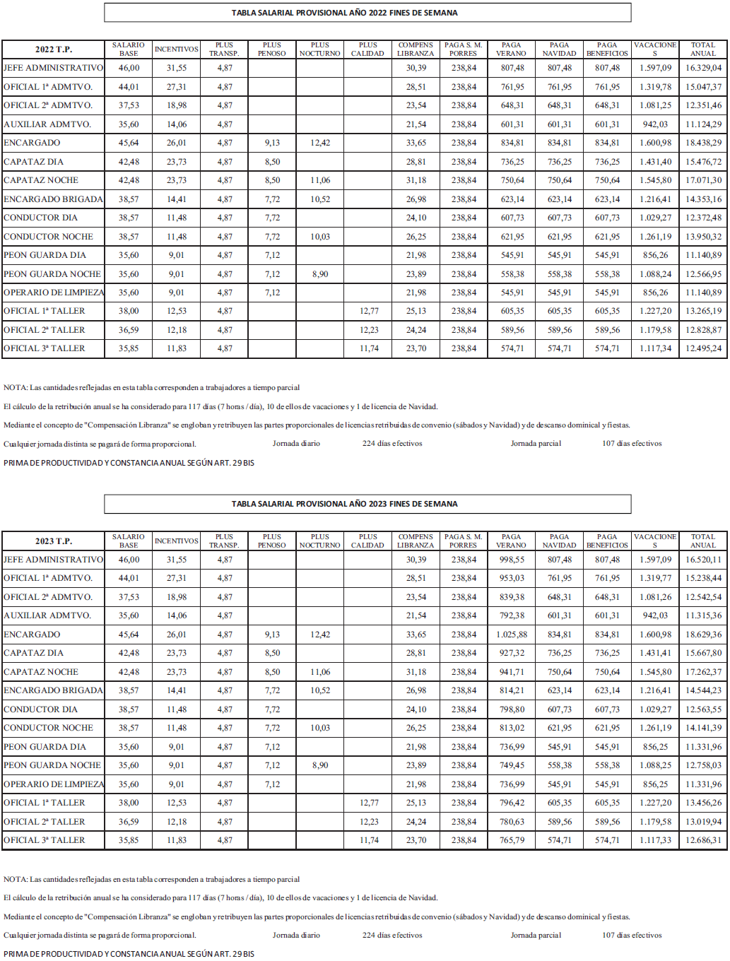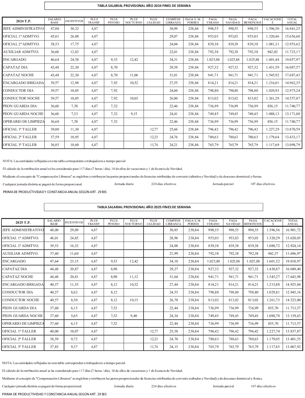 Por ambos partes se acuerda dar cumplimiento al Convenio Colectivo de aplicación, adjuntando a tal efecto como Anexo las tablas definitivas del año 2024, tanto para el personal de jornada completa como de sábados, domingos y festivos y que serán de aplicación por tanto desde el 1 de enero de 2024 Del personal de sábados, domingos y festivos no incluye la antigüedad, devengándose en su caso, 213,5612 días con la siguiente distribución: