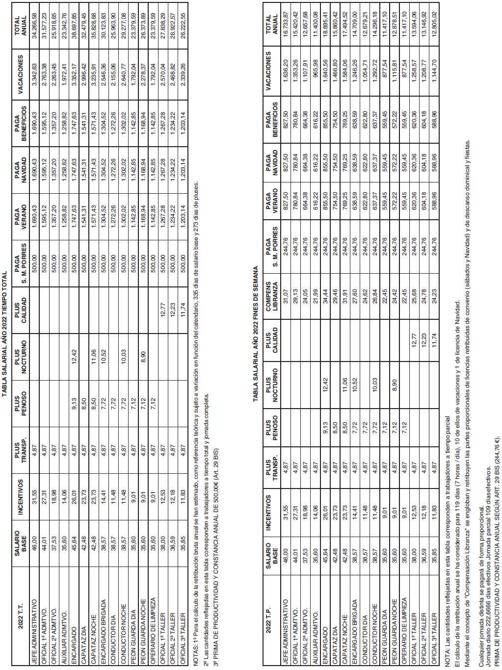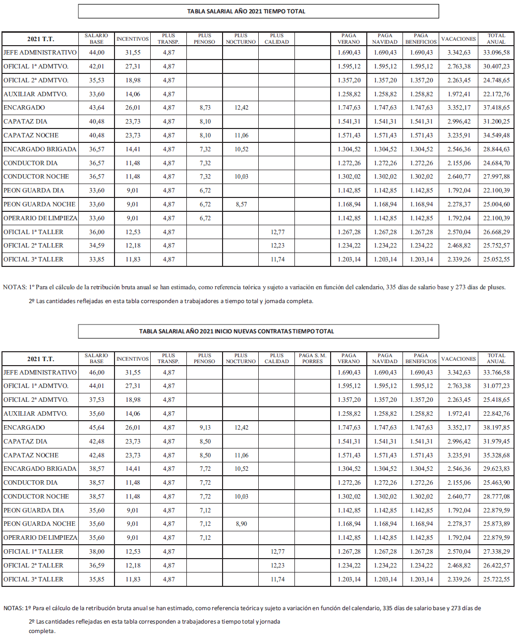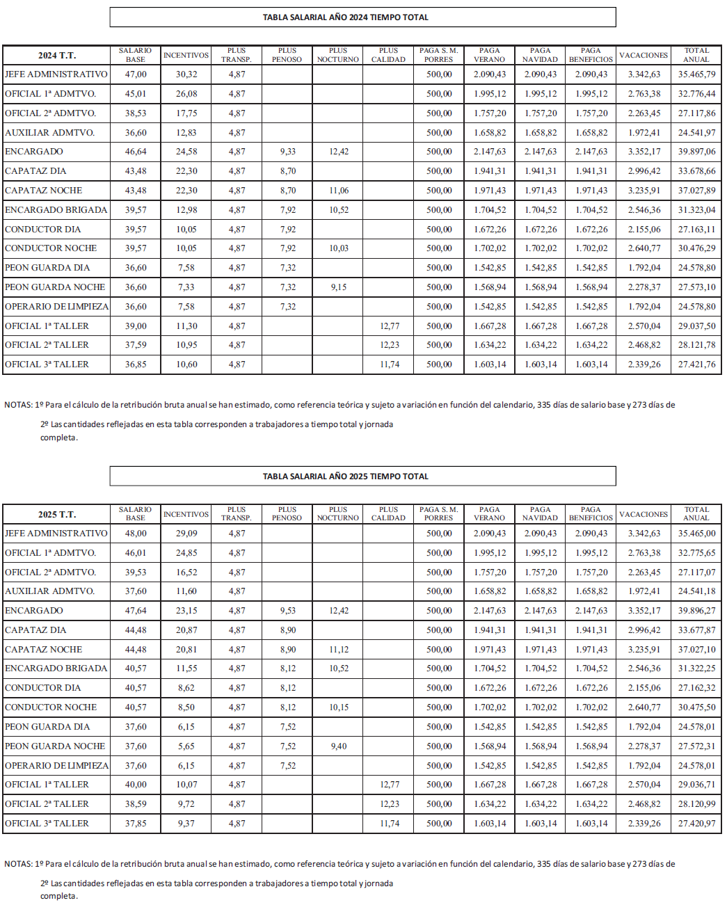 Por ambos partes se acuerda dar cumplimiento al Convenio Colectivo de aplicación, adjuntando a tal efecto como Anexo las tablas definitivas del año 2024, tanto para el personal de jornada completa como de sábados, domingos y festivos y que serán de aplicación por tanto desde el 1 de enero de 2024 Del personal de sábados, domingos y festivos no incluye la antigüedad, devengándose en su caso, 213,5612 días con la siguiente distribución: