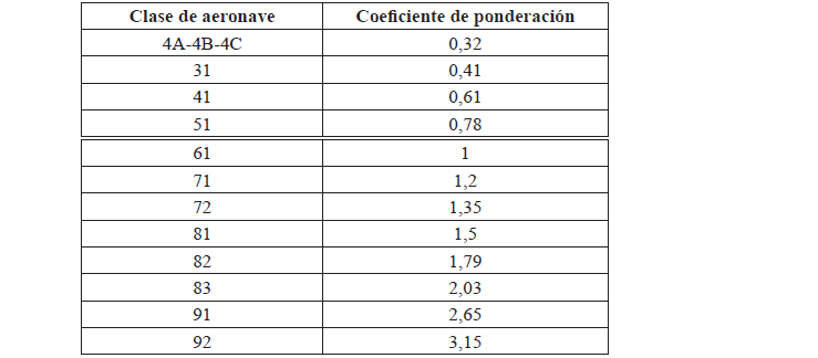 La actividad de aviones ponderados perdidos y la actividad de aviones totales ponderados se calcularán atendiendo a la siguiente tabla de ponderación.