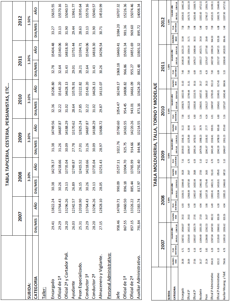 Se anexa al presente acta el resultado de los cálculos efectuados sobre las tablas del 2007, correspondientes a taller de carpintería, almacén de madera, tapicería y cestería, moldurería, talla, torno y modelaje y ebanistería y muebles curvados, de un incremento total acumulado del 12,5%, como resultado de la actualización pendiente desde el año 2007 hasta la actualidad.