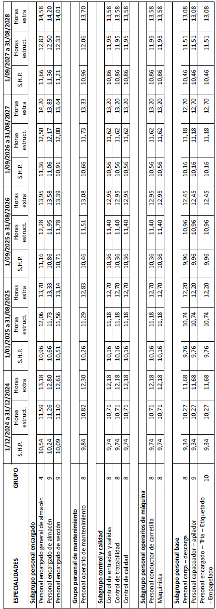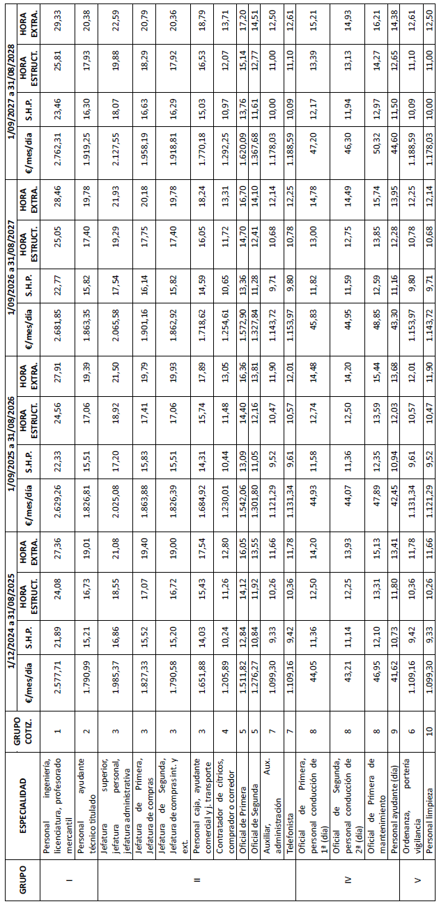 1. Las retribuciones pactadas en este convenio colectivo, correspondientes a las campañas 2024-2025 a 2027- 2028 (desde el 1 de diciembre de 2024 hasta el 31 de agosto de 2028) para los distintos grupos profesionales y especialidades son las que figuran en las tablas de salarios que como anexos 3 y 4 se unen a este texto.