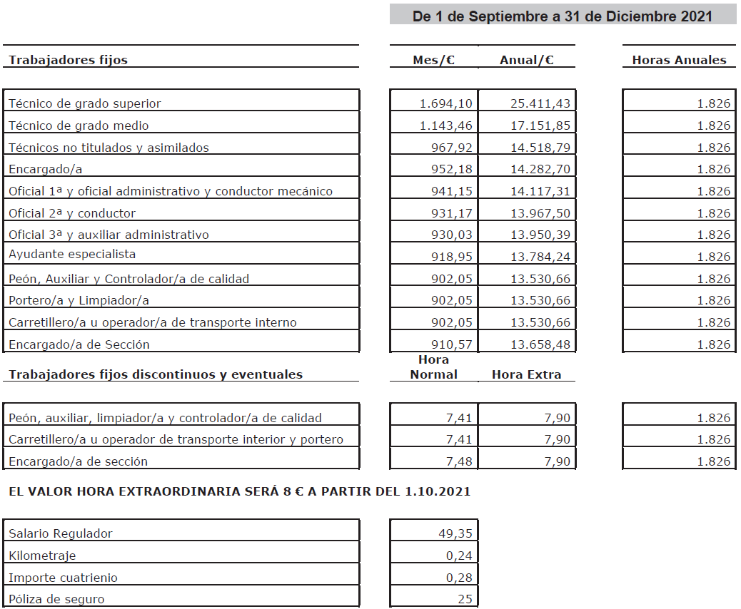 – Valor hora extraordinaria 8 euros con efectos de 01.10.2021.