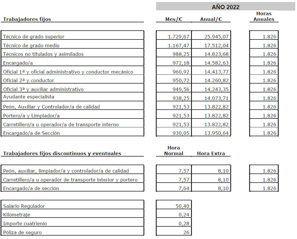 Año 2022: Se incrementarán los salarios el 2,1% sobre las tablas salariales de 2021. Valor hora extraordinaria 8,10 euros.