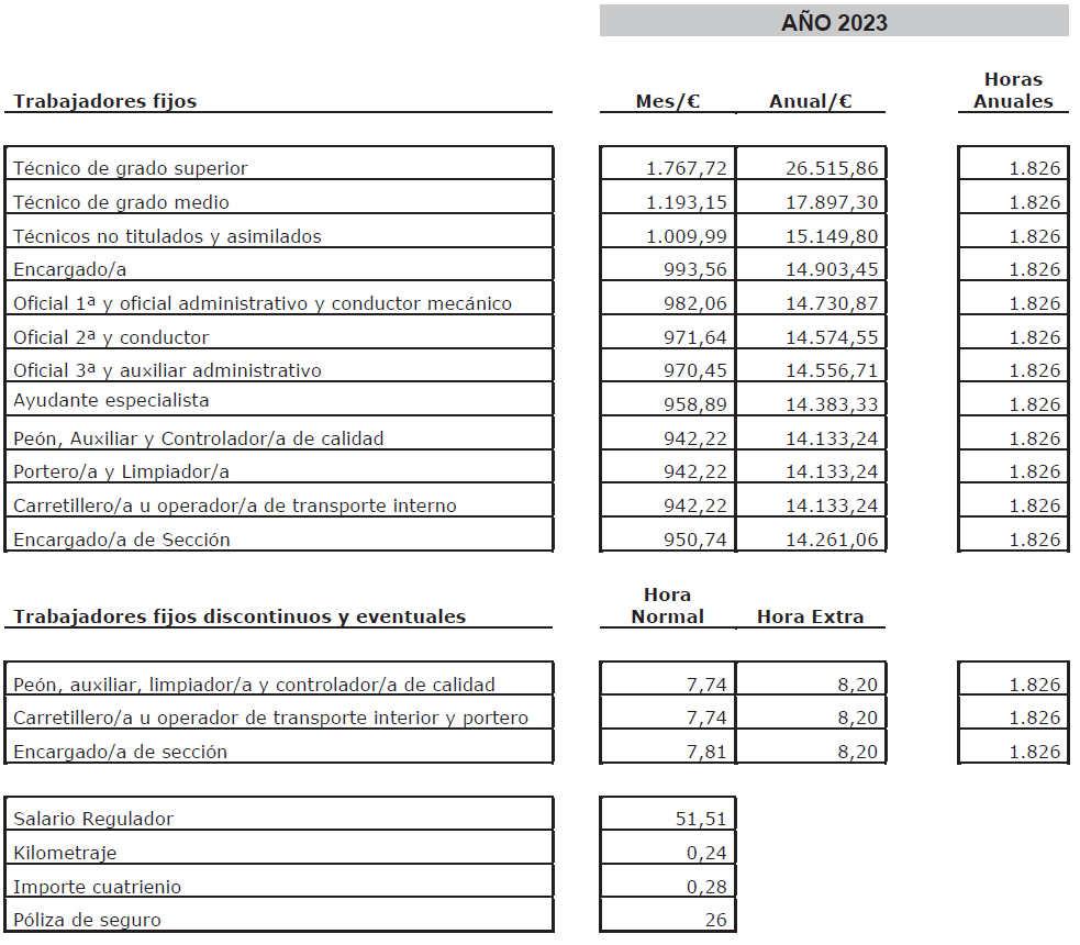 Año 2023: Se incrementarán los salarios el 2,2% sobre las tablas salariales de 2022. Valor hora extraordinaria 8,20 euros.