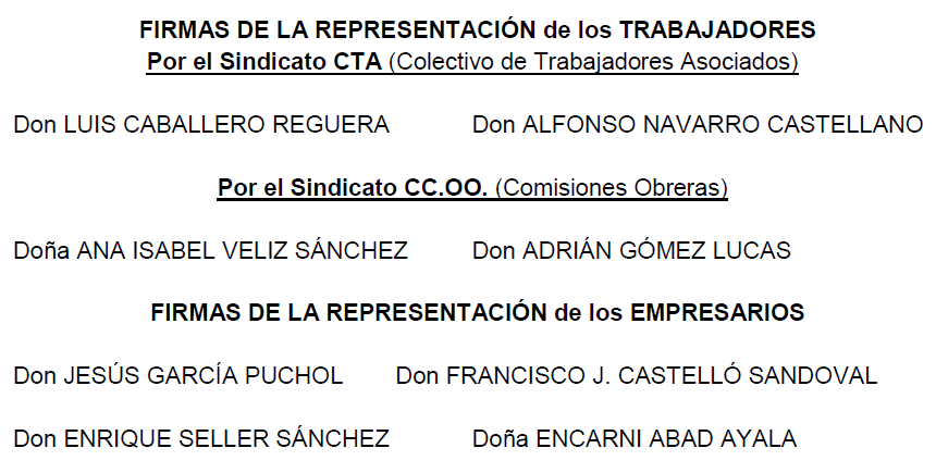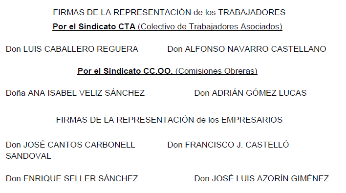 II. Dicho Acuerdo ha sido suscrito por la comisión paritaria del convenio colectivo referenciado formada, por la parte empresarial, por Mármol de Alicante Asociación de la Comunidad Valenciana y, por la parte social, por el Sindicato de Trabajadores Asociados (CTA) y por el Sindicato Comisiones Obreras (CCOO).