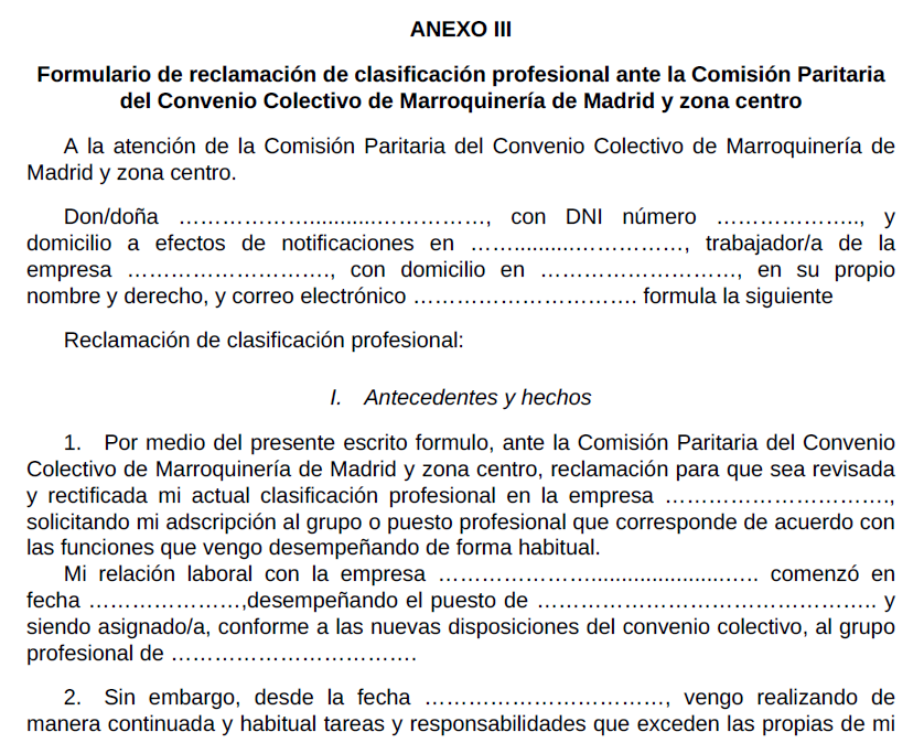 A tales efectos, la definición de Grupos y Niveles con los ejemplos de equivalencias del anexo I será la referencia para el mencionado encuadramiento. En caso de discrepancias derivadas de la aplicación de esta nueva clasificación, las personas trabajadoras deberán presentar su reclamación ante la comisión paritaria establecida en este convenio colectivo adjuntando el formulario recogido en el anexo III de este convenio.