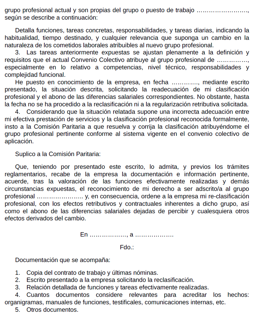 A tales efectos, la definición de Grupos y Niveles con los ejemplos de equivalencias del anexo I será la referencia para el mencionado encuadramiento. En caso de discrepancias derivadas de la aplicación de esta nueva clasificación, las personas trabajadoras deberán presentar su reclamación ante la comisión paritaria establecida en este convenio colectivo adjuntando el formulario recogido en el anexo III de este convenio.