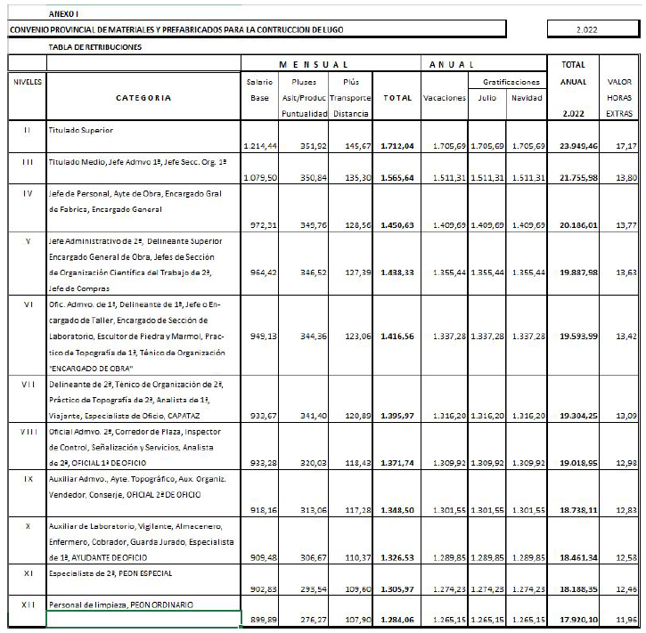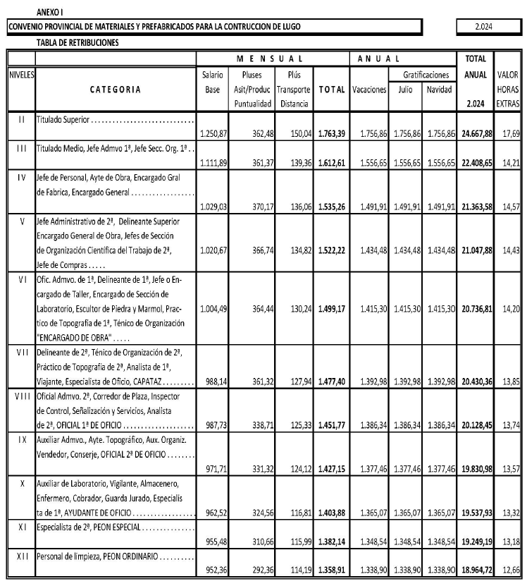 En la ciudad de Lugo a 14.12.2023 se reúnen los representantes de las Centrales Sindicales y de APEC que al margen se relacionan, con el objeto de proceder a la firma, en su caso, a la aprobación de la tabla salarial vigente para el 2024, del Convenio de Materiales y Prefabricados de la Construcción de la provincia de Lugo suscrito en fecha 28.9.2023, para los años 2023-2026, pendiente de publicación; reconociéndose con legitimación y capacidad suficiente, para los años 2022 al 2026 incluido, con la representatividad que poseen, adoptando los siguientes